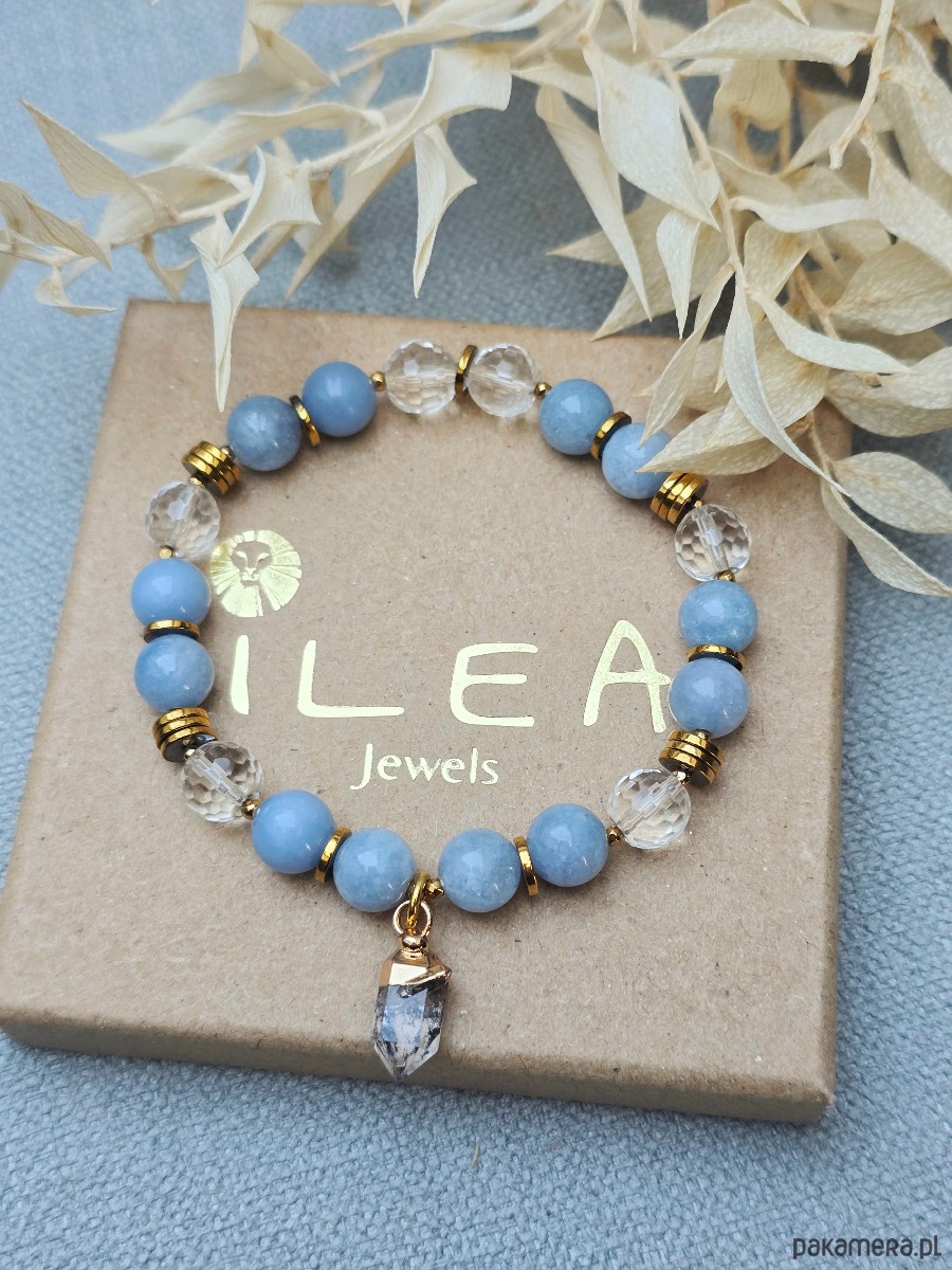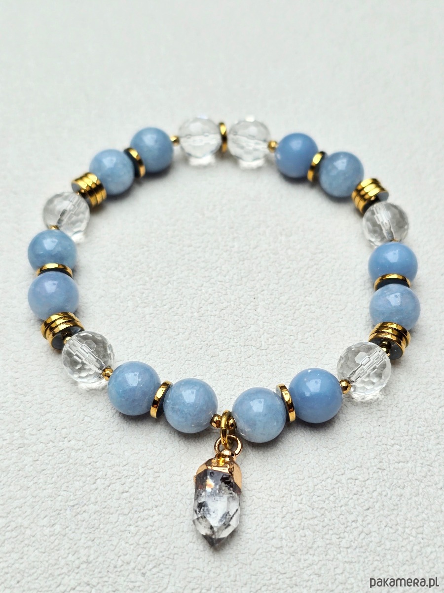 Bransoletka elastyczna z błękitnym angelitem, kryształem górskim i złoconym hematytem. Ozdobą bransoletki jest zawieszka z kryształu górskiego.