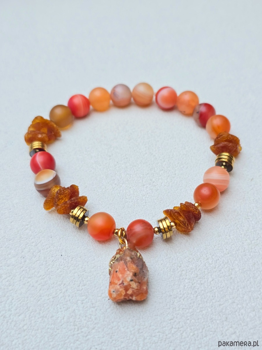 Bransoletka elastyczna z agatem karneolowym, bursztynem i złoconym hematytem. Ozdobą bransoletki jest zawieszka z surowego agatu.