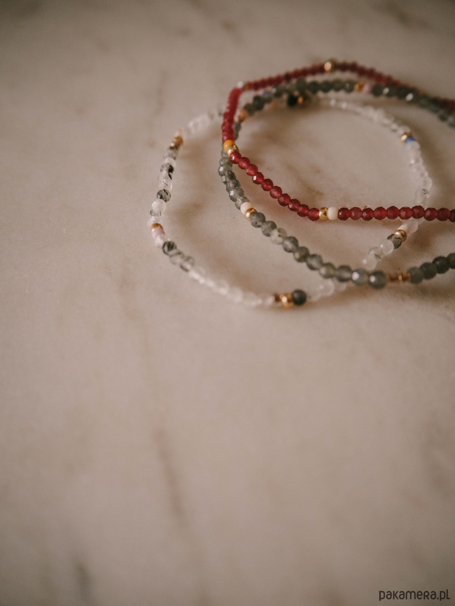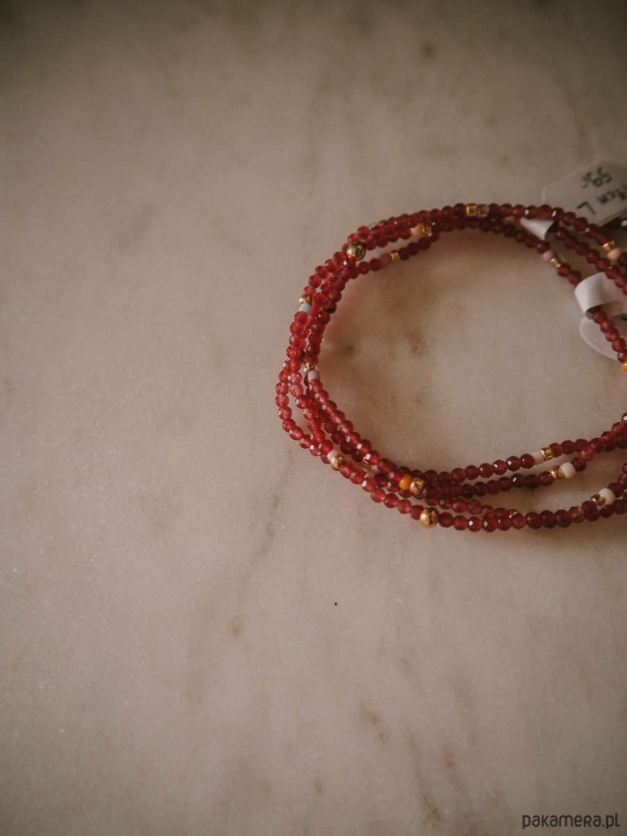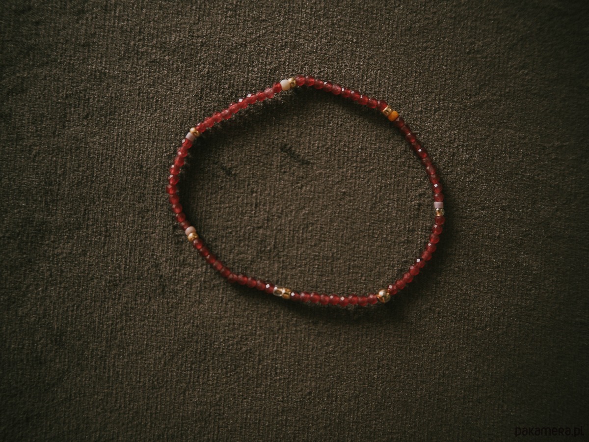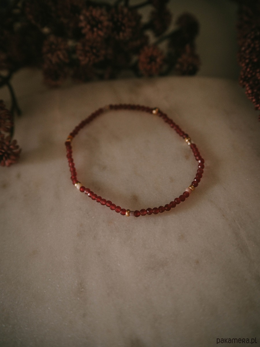 Drobna, pełna blasku i energii. Czerwony jadeit w odcieniach czerwonego wina dodaje subtelności, ale też ciepła każdej stylizacji. Maleńkie kamienie o średnicy 2 mm pięknie odbijają światło, tworząc wrażenie delikatnej iskierki na nadgarstku.