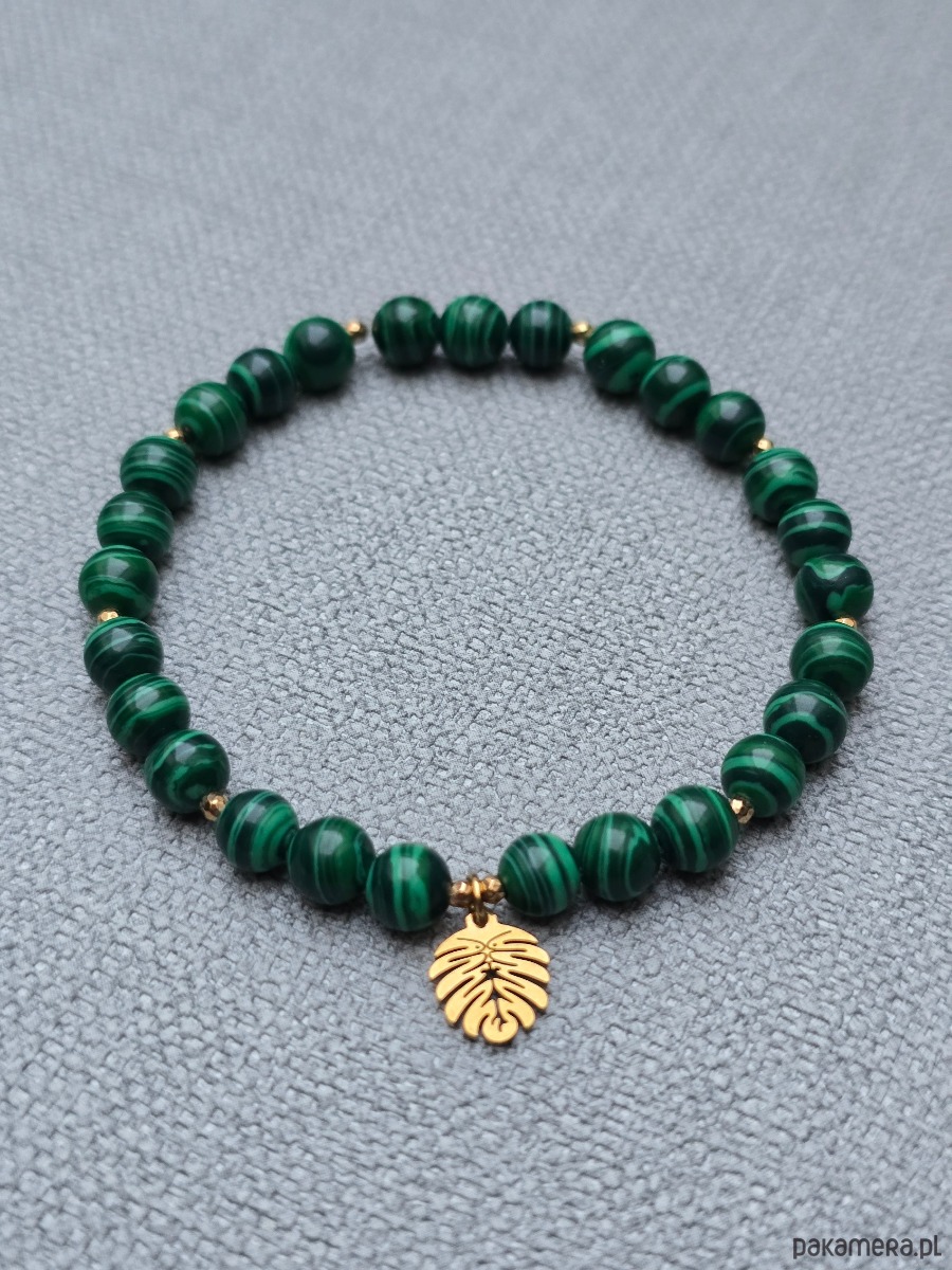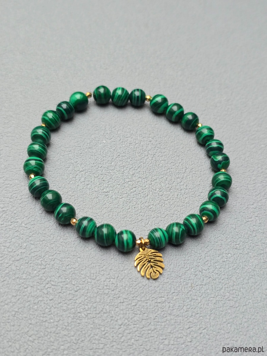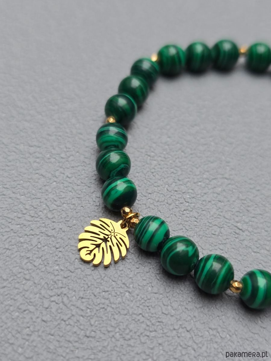 Bransoletka elastyczna z zielonym malachitem i złoconym hematytem. Ozdobą bransoletki jest mała zawieszka- listek monstery
