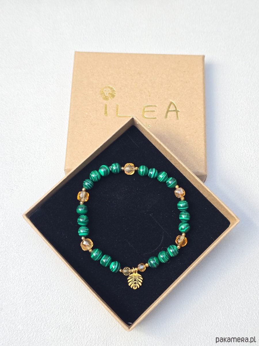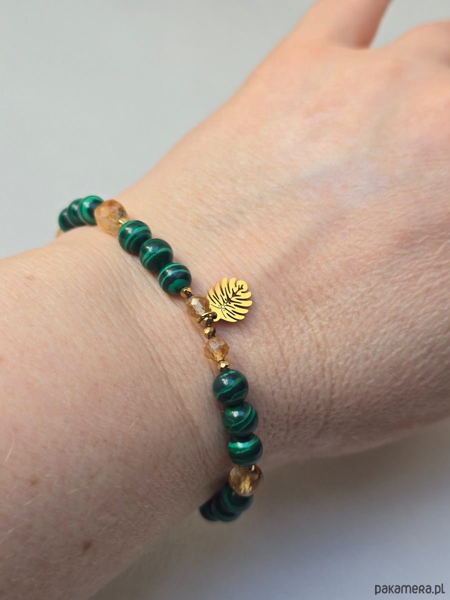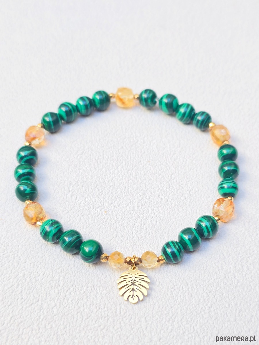 Bransoletka elastyczna z zielonymi kulkami malachitu i fasetowanymi cytrynami. Ozdobą bransoletki jest mała zawieszka- listek monstery