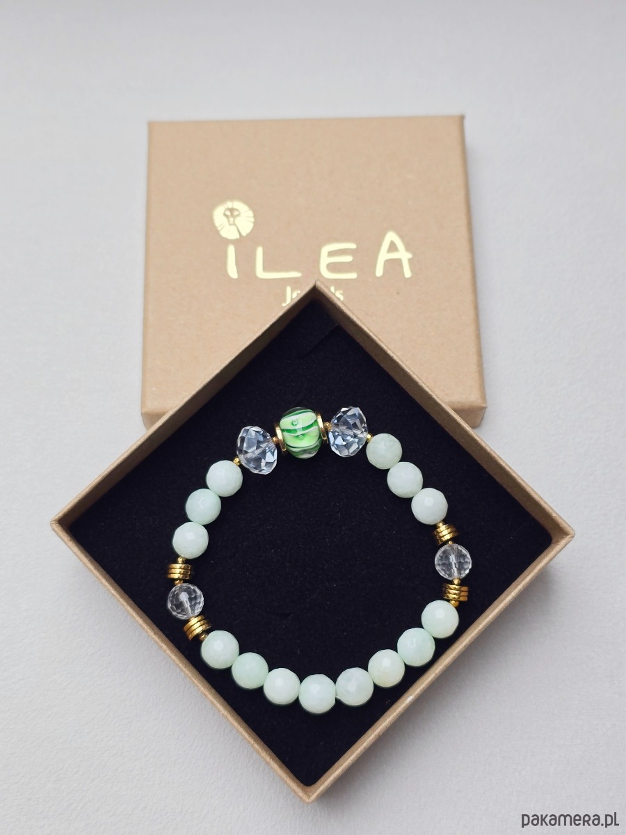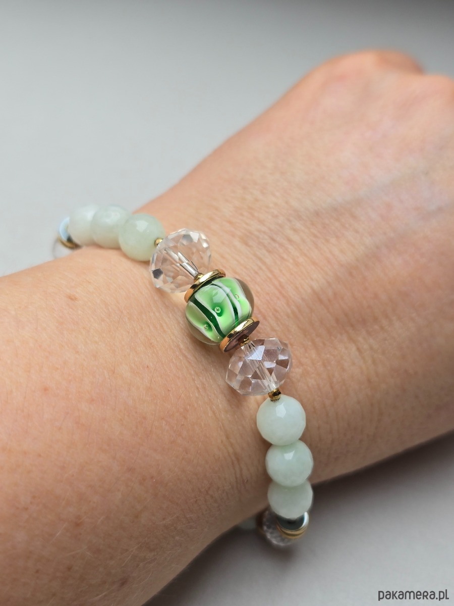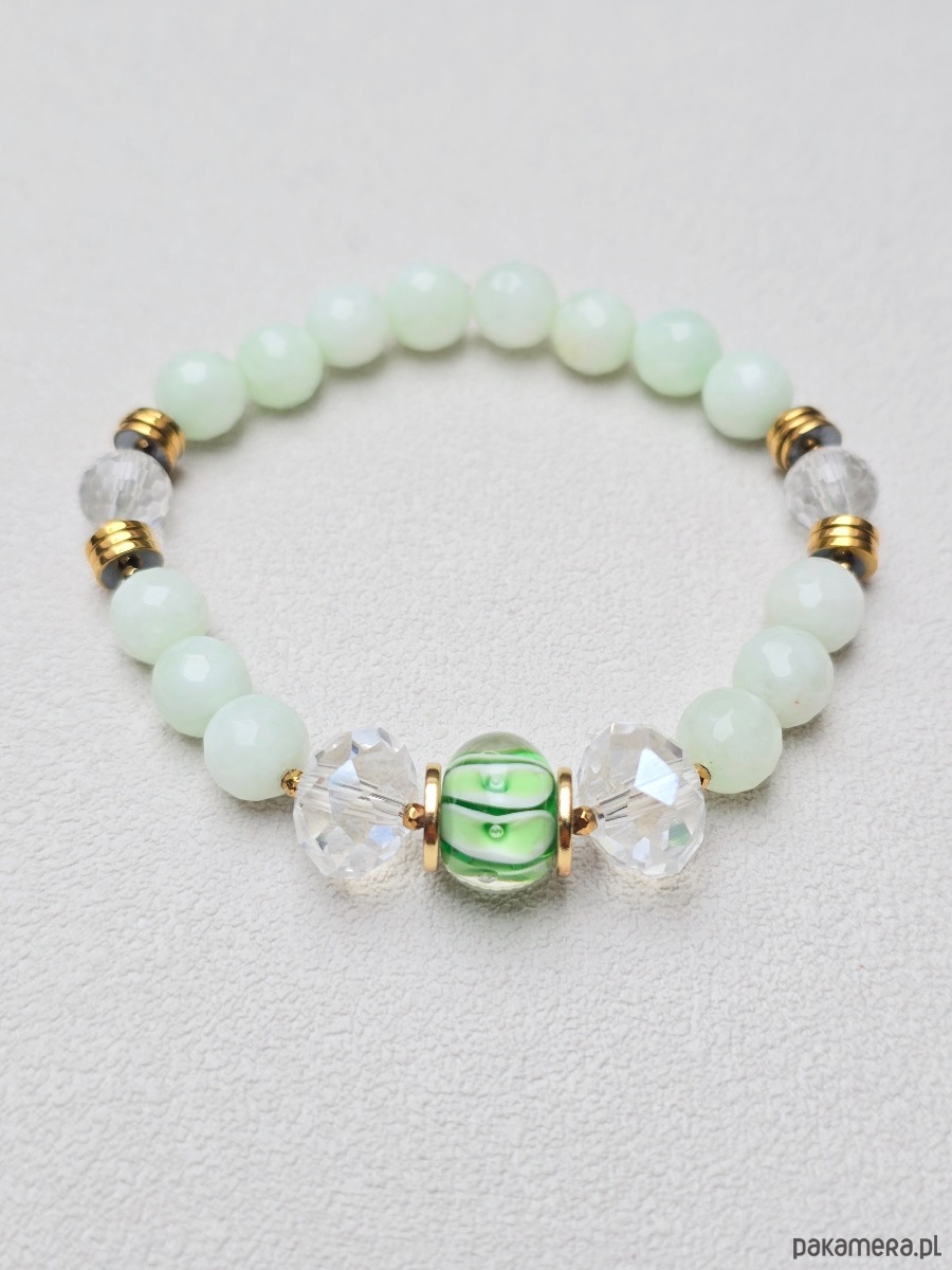 Bransoletka elastyczna z miętowym jadeitem, kryształem górskim, kryształkami oraz centrycznie umieszczonym, ręcznie robionym koralikiem lampwork.