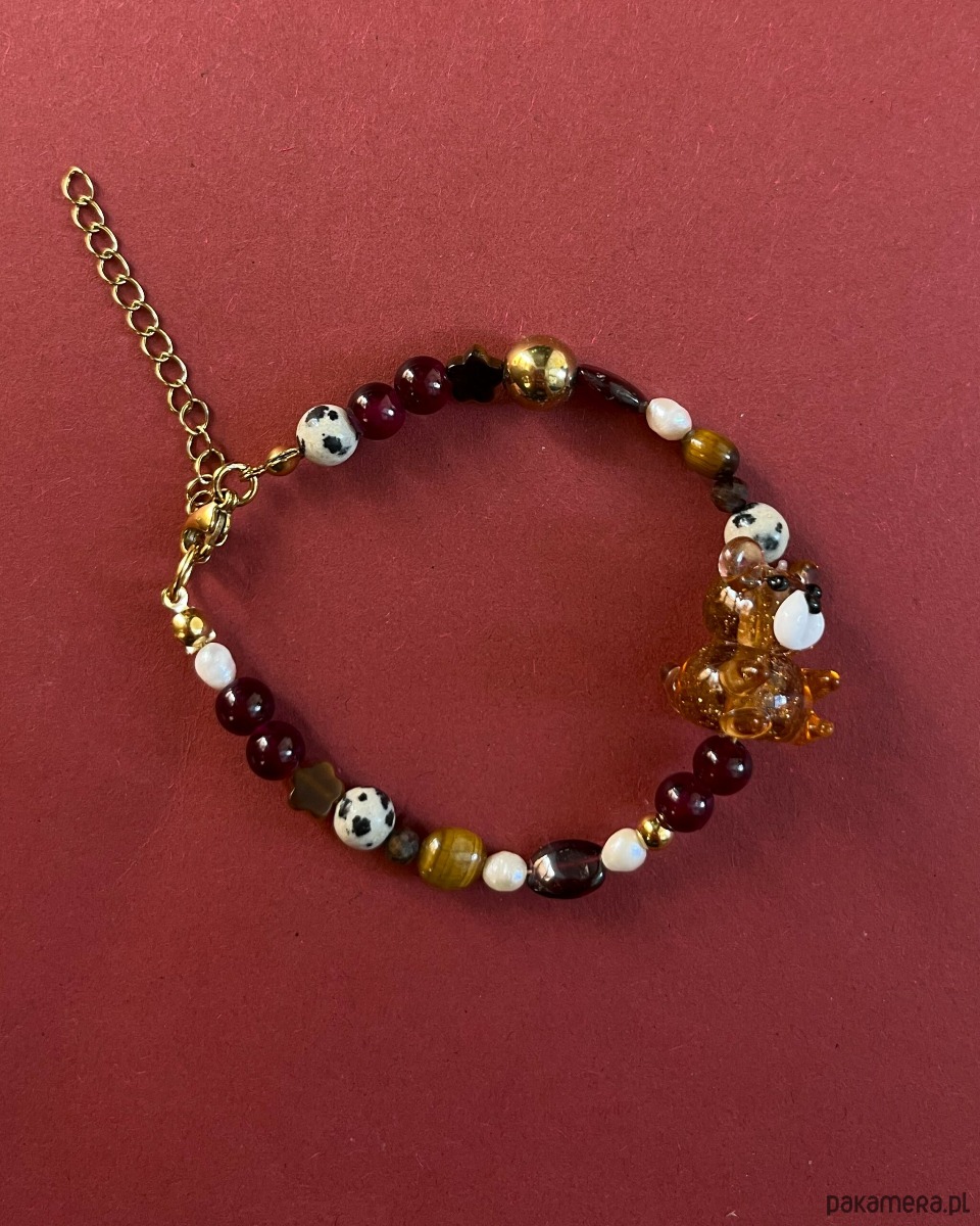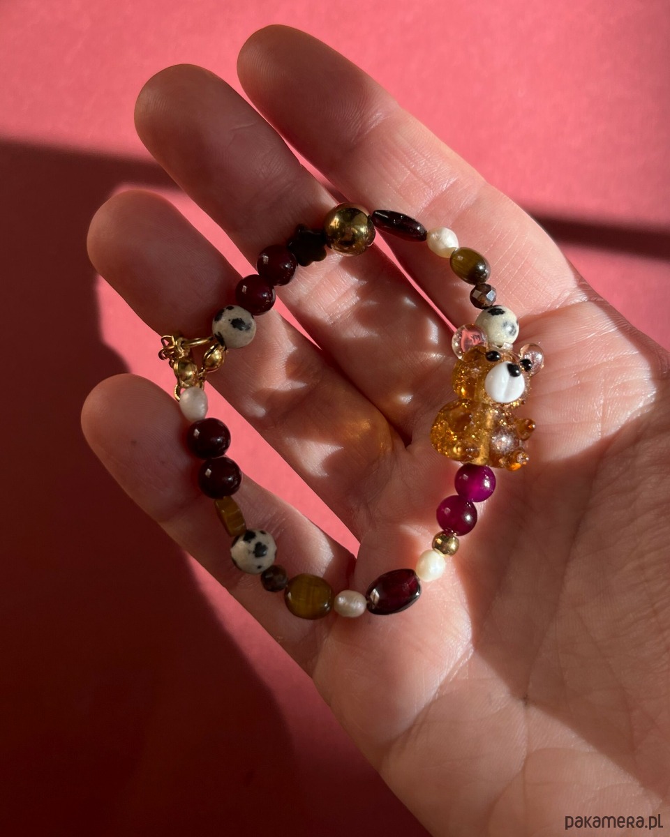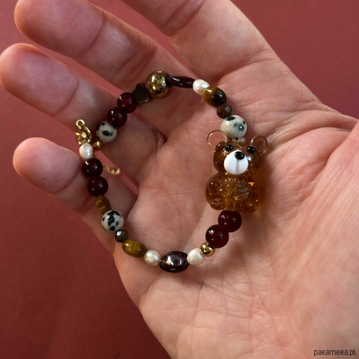 Bransoletka Ember to połączenie ciepła i światła zaklętego w kamieniach. Całość kompozycji dopełnia wyjątkowy akcent – szklany miś w kolorze brązu, niczym mały symbol wspomnień i czułości.