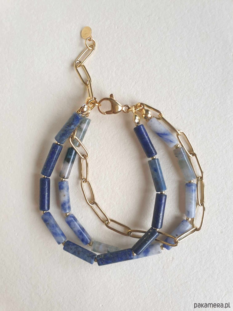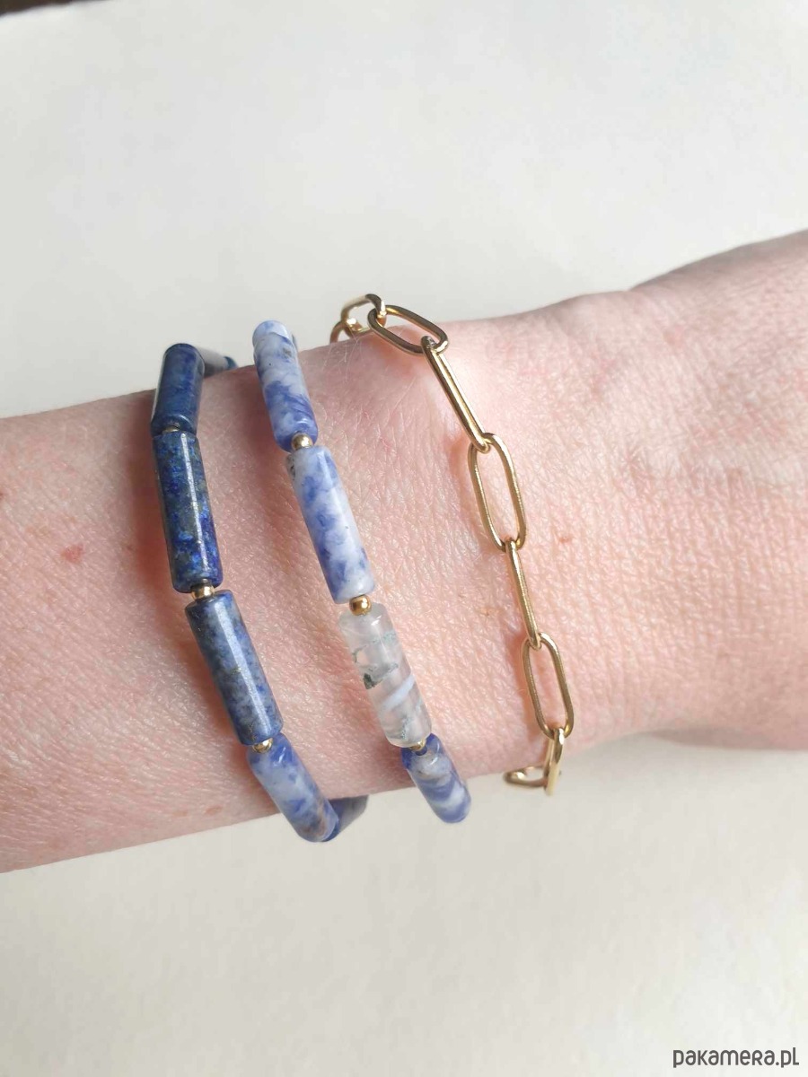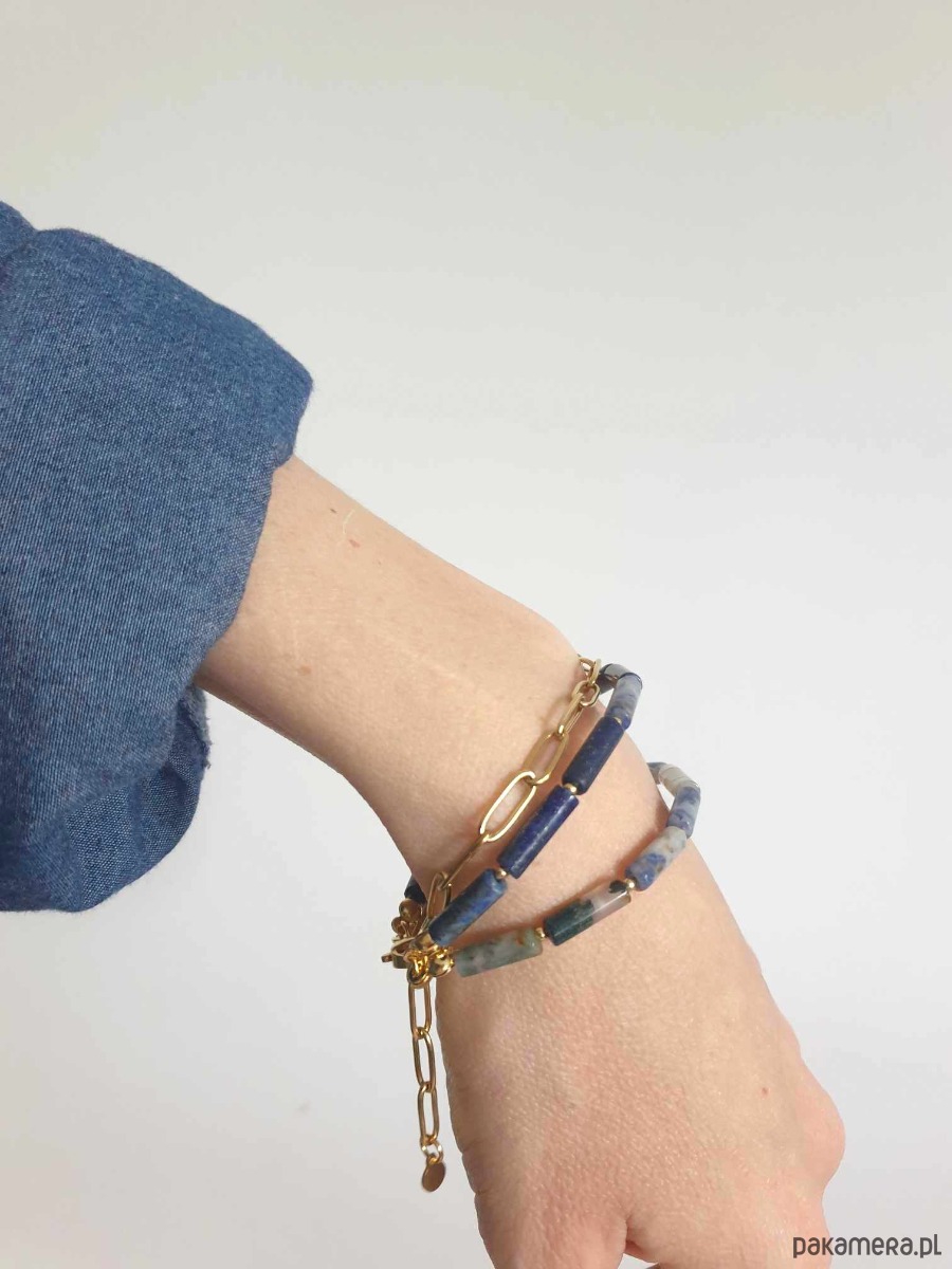 Minimalistyczna bransoletka FALA. Tworzona z elementów ze stali szlachetnej (antyalergicznej) pozłacanej, z kamieniami: agat mszysty, jaspis niebieski, lapis lazuli
