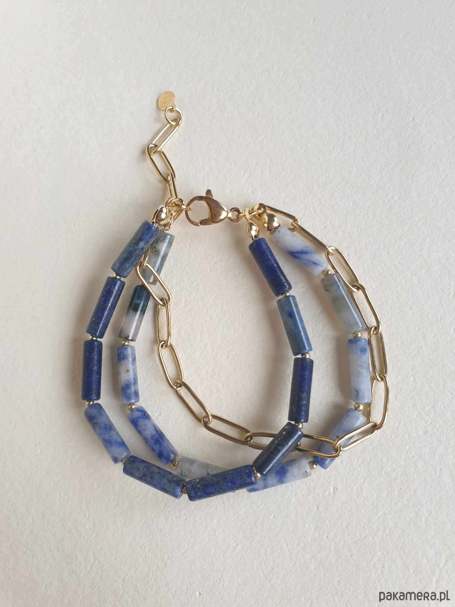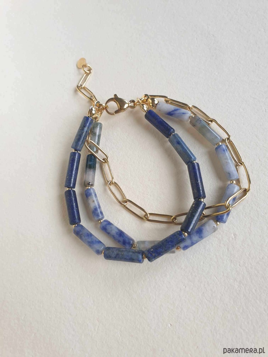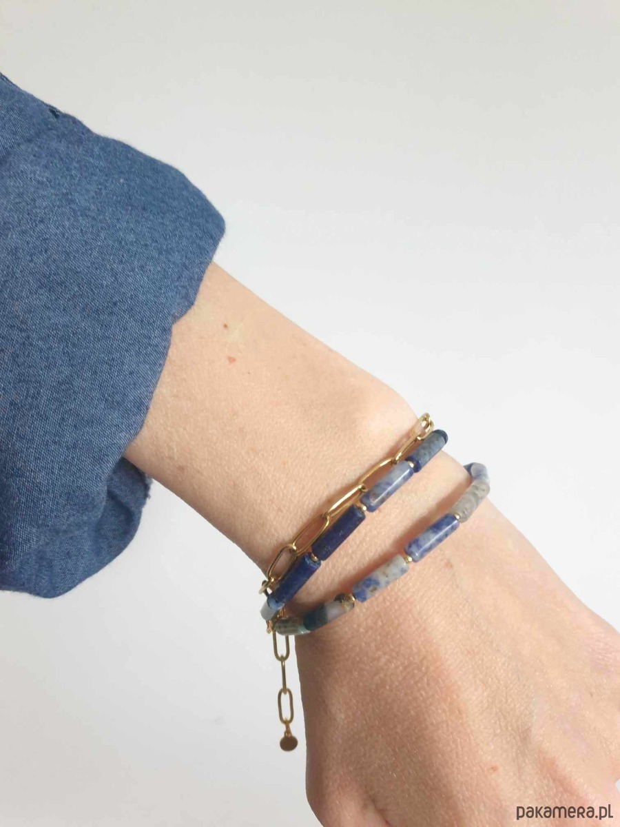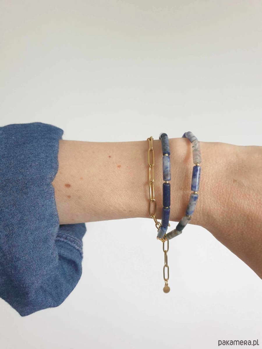 Minimalistyczna bransoletka FALA. Tworzona z elementów ze stali szlachetnej (antyalergicznej) pozłacanej, z kamieniami: agat mszysty, jaspis niebieski, lapis lazuli