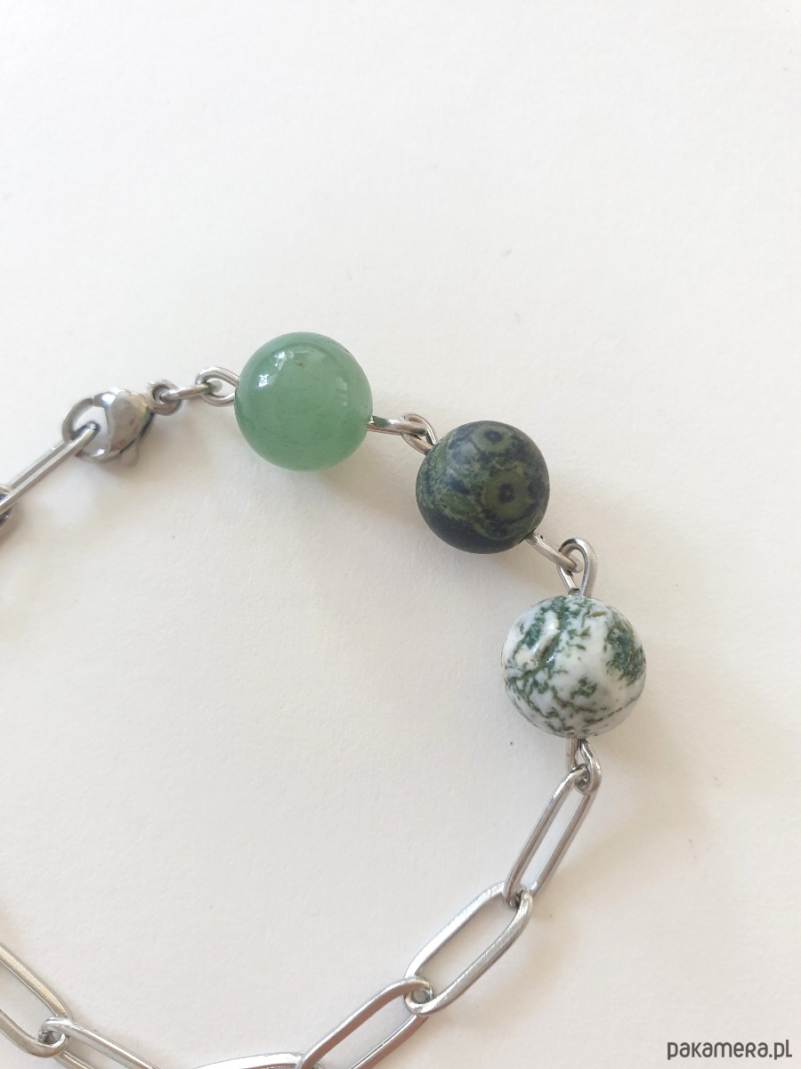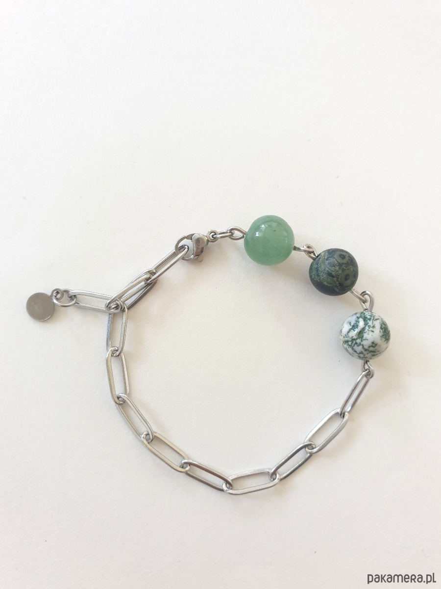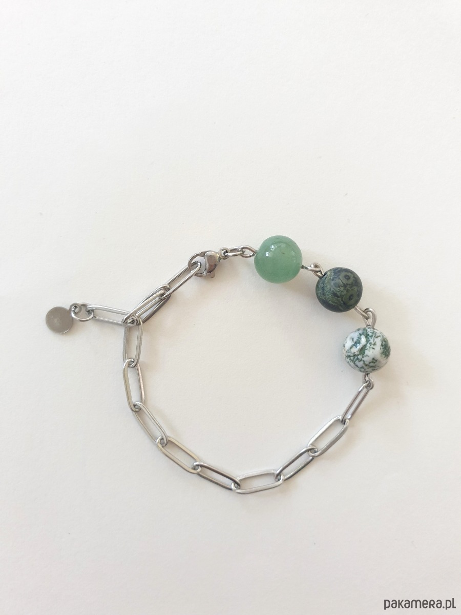 Minimalistyczna delikatna bransoletka kulki z kolekcji FANABERIA. Tworzona ręcznie z kamieni naturalnych, łańcucha i elementów ze stali szlachetnej (antyalergicznej) W tej - kulka agat mszysty, jaspis kambaba, awenturyn. Na zdjęciu przykładowa bransoletka, tworzę ją z tych samych kamieni i elementów w tej samej tonacji jednak może się minimalnie różnić bo każdy kamień jest wyjątkowy. Bransoletkę mogę zrobić z dowolnymi kamieniami które mam w ofercie, albo ze złoconym łańcuszkiem, napisz.