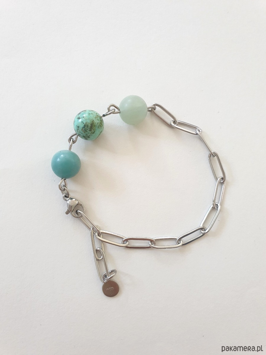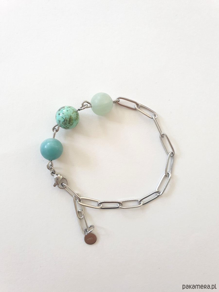Minimalistyczna delikatna bransoletka kulki z kolekcji FANABERIA. Tworzona ręcznie z kamieni naturalnych, łańcucha i elementów ze stali szlachetnej (antyalergicznej) W tej - kulka amazonit, akwamaryn, turkus. Na zdjęciu przykładowa bransoletka, tworzę ją z tych samych kamieni i elementów w tej samej tonacji jednak może się minimalnie różnić bo każdy kamień jest wyjątkowy. Bransoletkę mogę zrobić z dowolnymi kamieniami które mam w ofercie, albo ze złoconym łańcuszkiem, napisz.