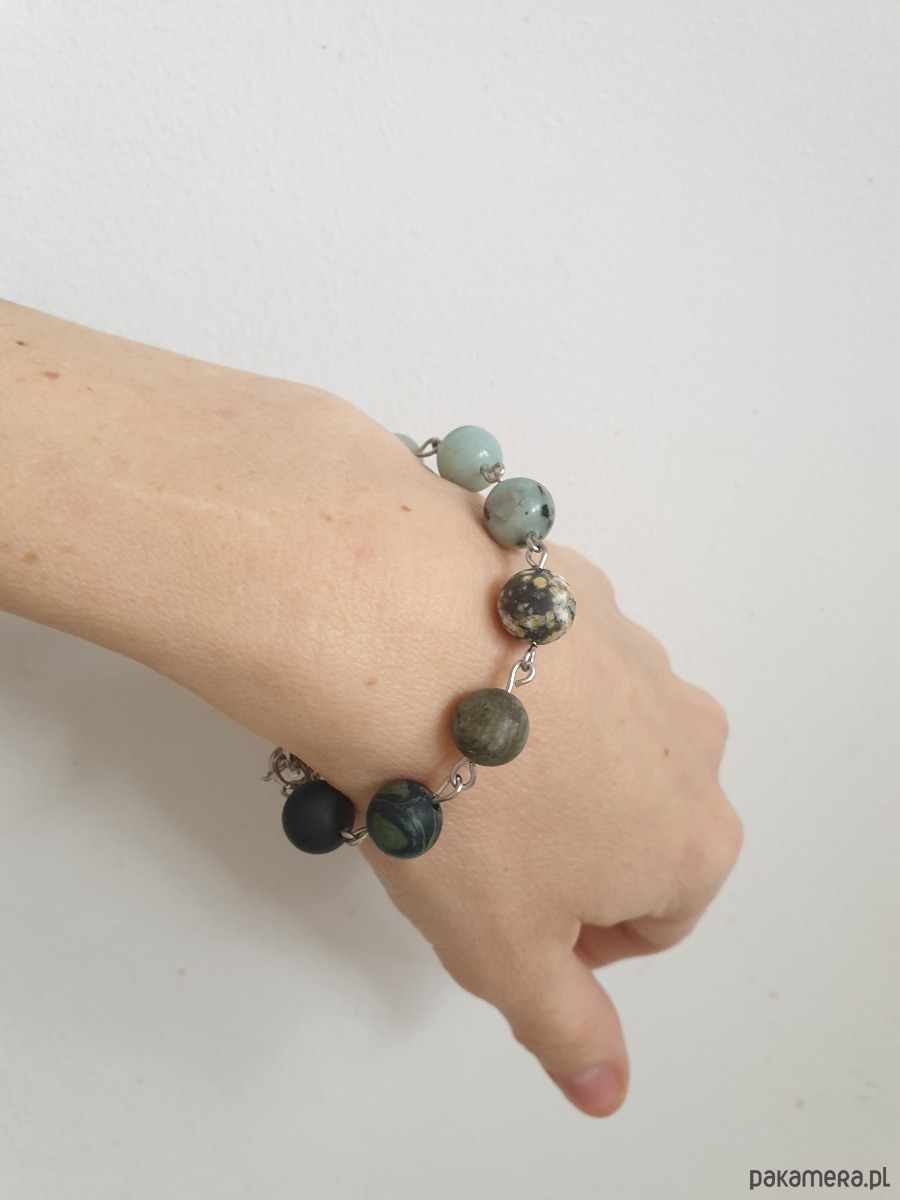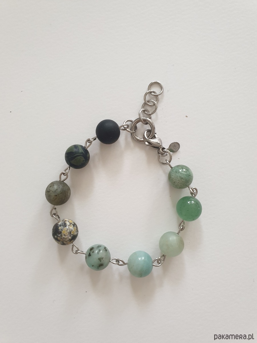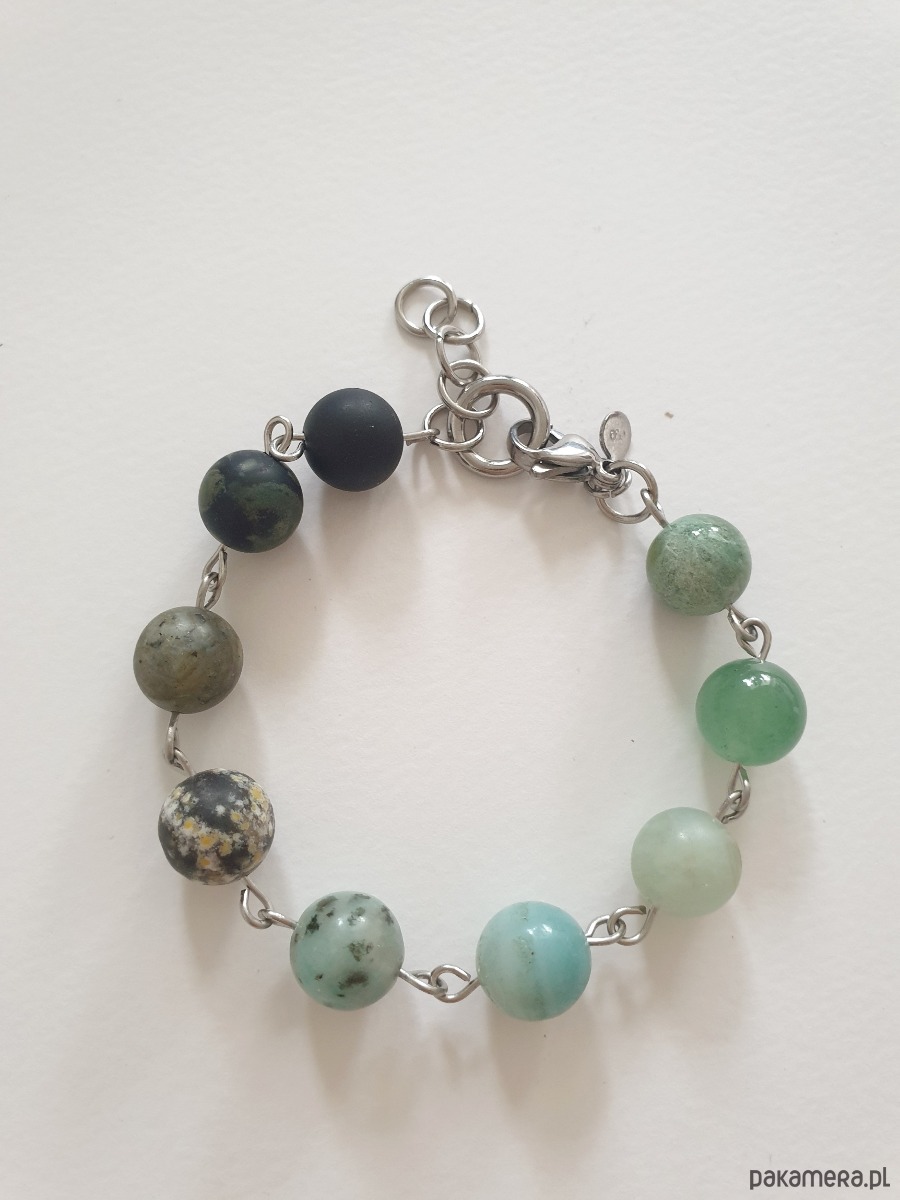 Minimalistyczna delikatna bransoletka kulki z kolekcji FANABERIA, w zielonych odcieniach ( turkus, zieleń, szary, czarny). Tworzona ręcznie z kamieni naturalnych, łańcucha i elementów ze stali szlachetnej (antyalergicznej) W tej - kulka czarny turmalin, jaspis kambaba, labradoryt, jaspis oceaniczny, jaspis lotus, amazonit, akwamaryn, awenturyn, agat drzewny