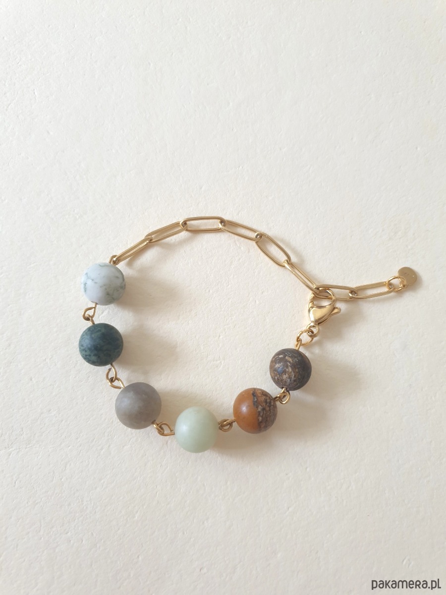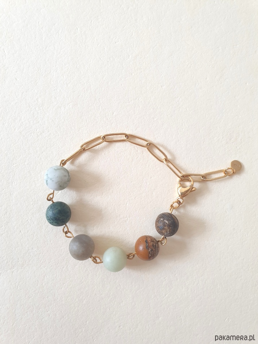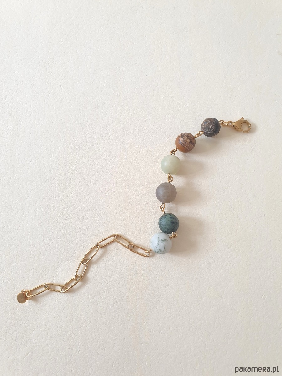 Minimalistyczna delikatna bransoletka kulki z kolekcji FANABERIA. Tworzona ręcznie z kamieni naturalnych, łańcucha i elementów ze stali szlachetnej pozłacanej (antyalergicznej) W tej - matowa kulka agat drzewny, jaspis kambaba, labradoryt, akwamaryn, jaspis obrazkowy, bronzyt.