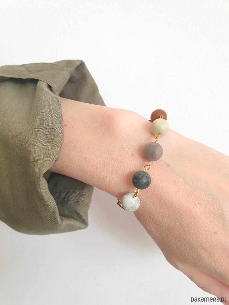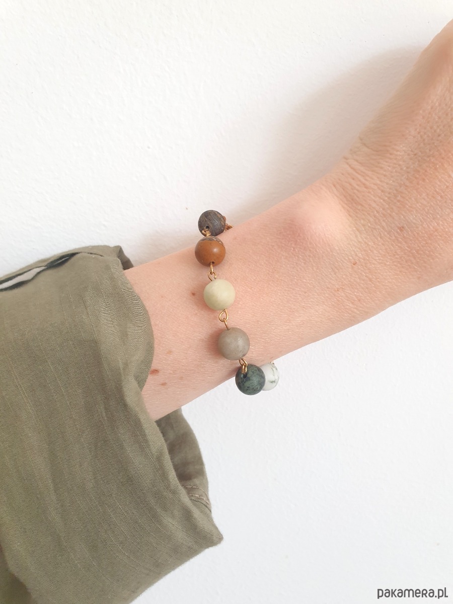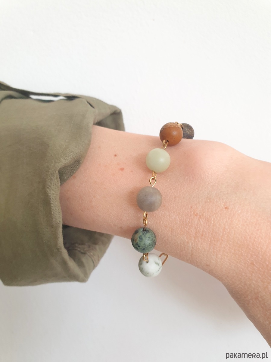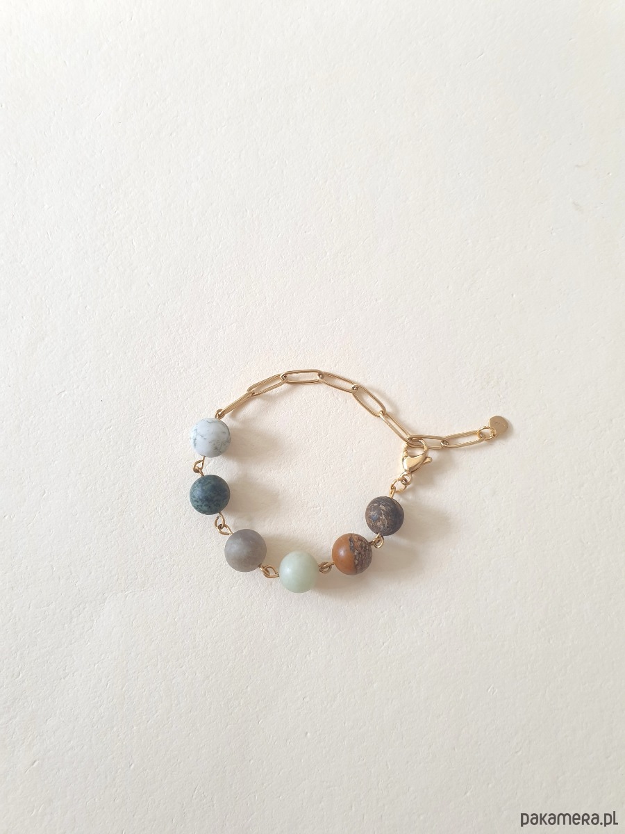 Minimalistyczna delikatna bransoletka kulki z kolekcji FANABERIA. Tworzona ręcznie z kamieni naturalnych, łańcucha i elementów ze stali szlachetnej pozłacanej (antyalergicznej) W tej - matowa kulka agat drzewny, jaspis kambaba, labradoryt, akwamaryn, jaspis obrazkowy, bronzyt.