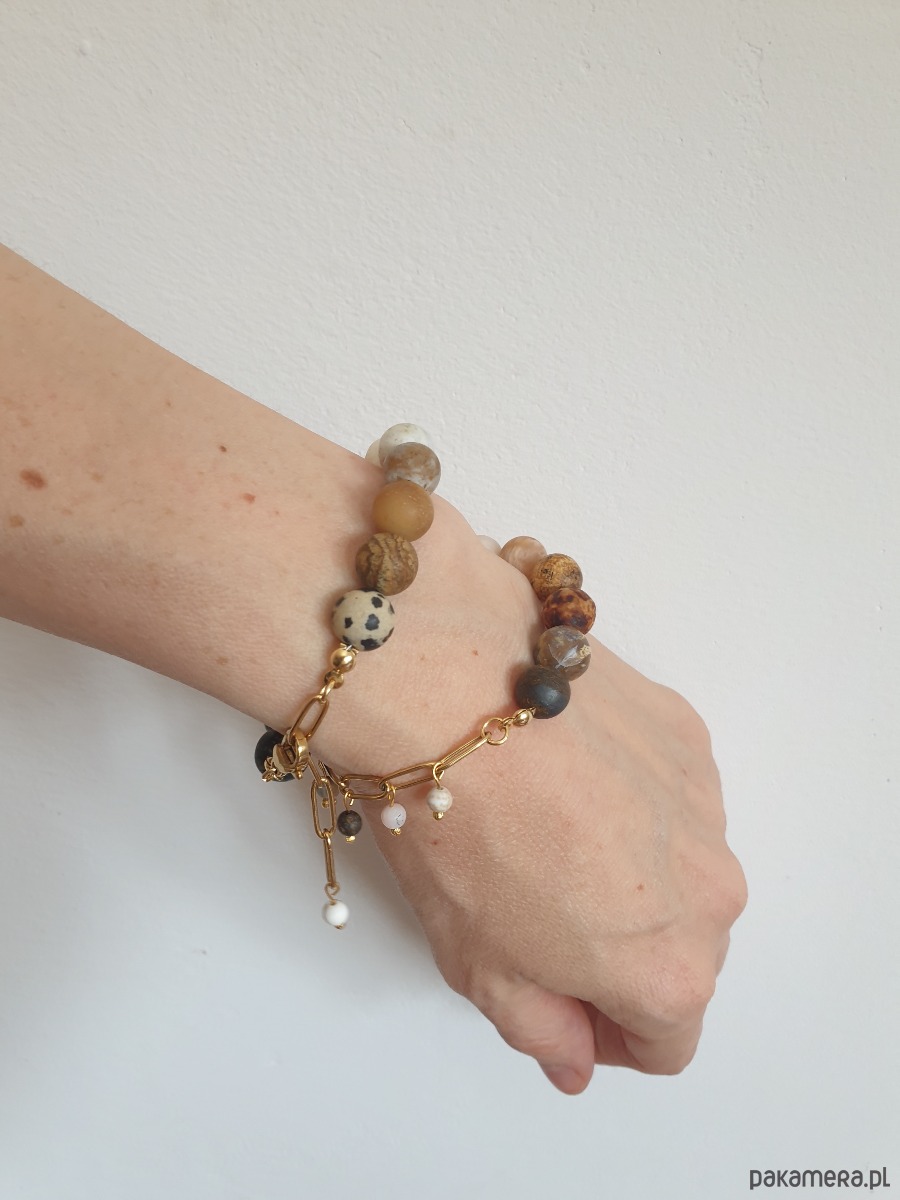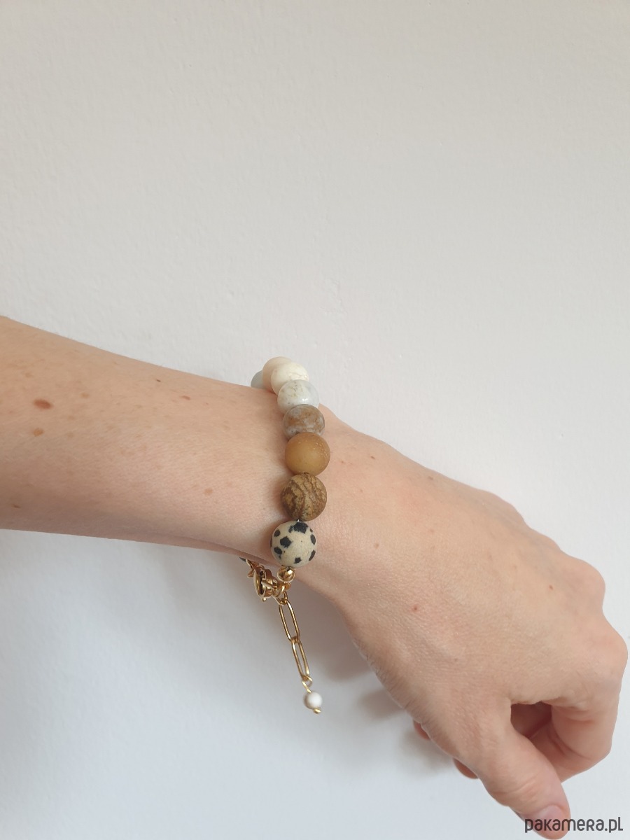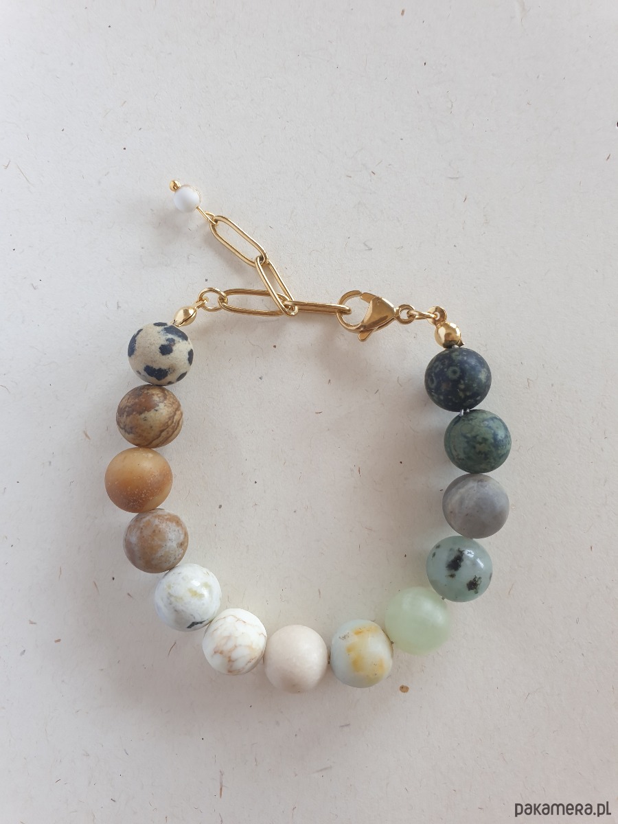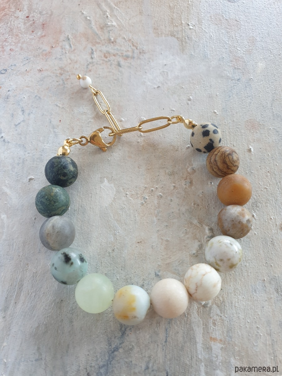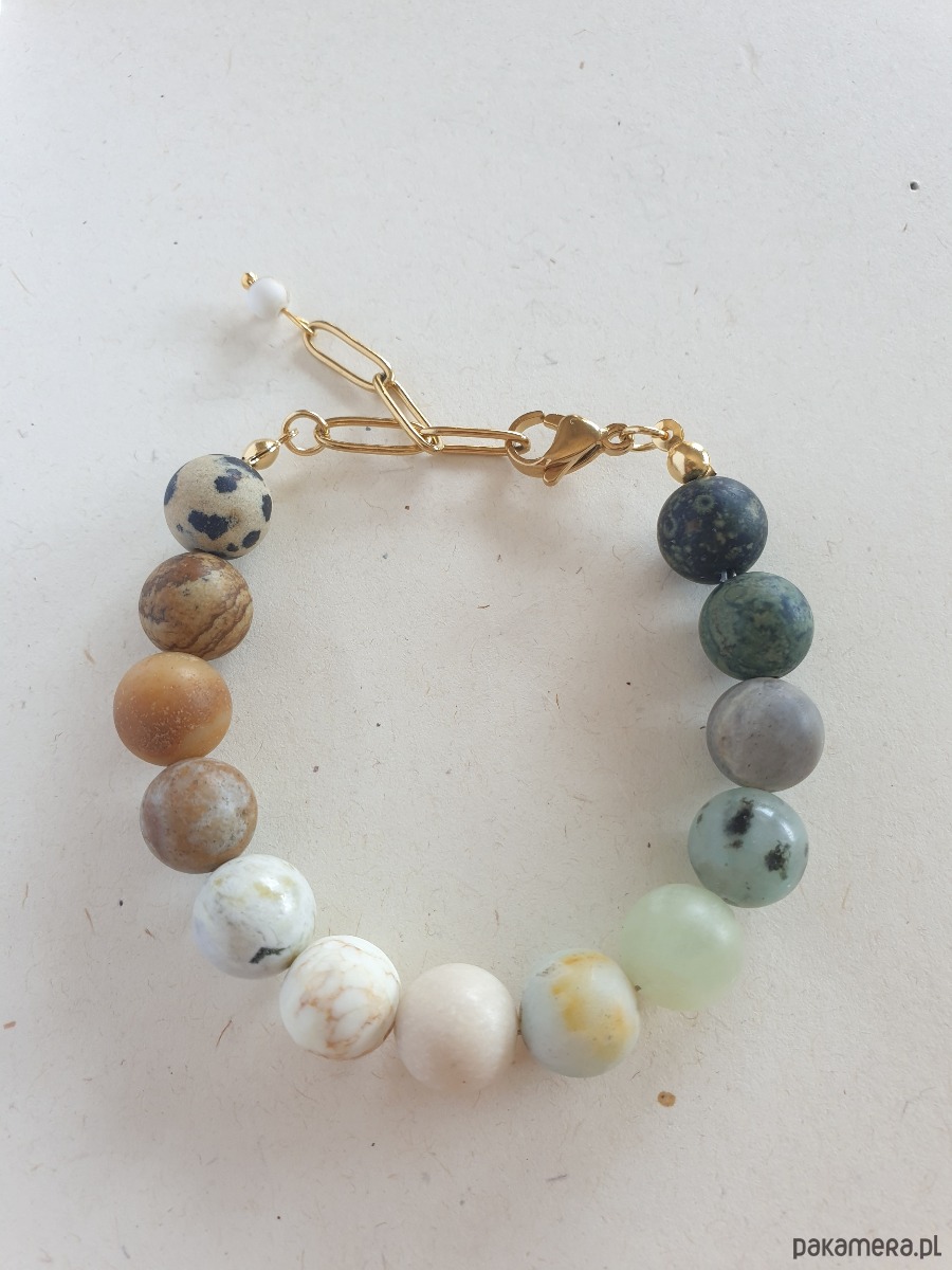 Minimalistyczna delikatna bransoletka kulki z kolekcji FANABERIA. Tworzona ręcznie z kamieni naturalnych, łańcucha i elementów ze stali szlachetnej pozłacanej (antyalergicznej) W tej - matowa kulka jaspis dalamtyński, jaspis obrazkowy, amazonit, kamień księżycowy, howlit, kamień rzeczny, akwamaryn, jaspis lotus, labradoryt, jaspis kambaba, jaspis oceaniczny. Bransoletke robię na zamówienie z tych samych kamieni w podobnej tonacji kolorystycznej, ale mogą być minimalne różnice bo każdy kamień jest wyjątkowy.