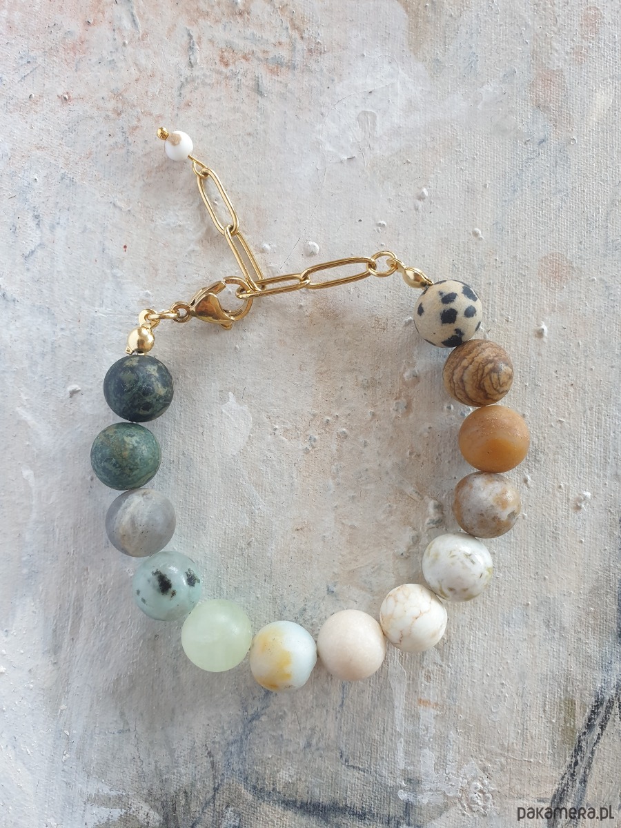 Minimalistyczna delikatna bransoletka kulki z kolekcji FANABERIA. Tworzona ręcznie z kamieni naturalnych, łańcucha i elementów ze stali szlachetnej pozłacanej (antyalergicznej) W tej - matowa kulka jaspis dalamtyński, jaspis obrazkowy, amazonit, kamień księżycowy, howlit, kamień rzeczny, akwamaryn, jaspis lotus, labradoryt, jaspis kambaba, jaspis oceaniczny. Bransoletke robię na zamówienie z tych samych kamieni w podobnej tonacji kolorystycznej, ale mogą być minimalne różnice bo każdy kamień jest wyjątkowy.