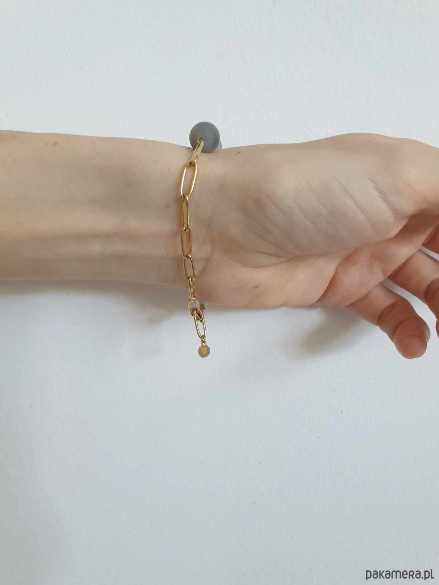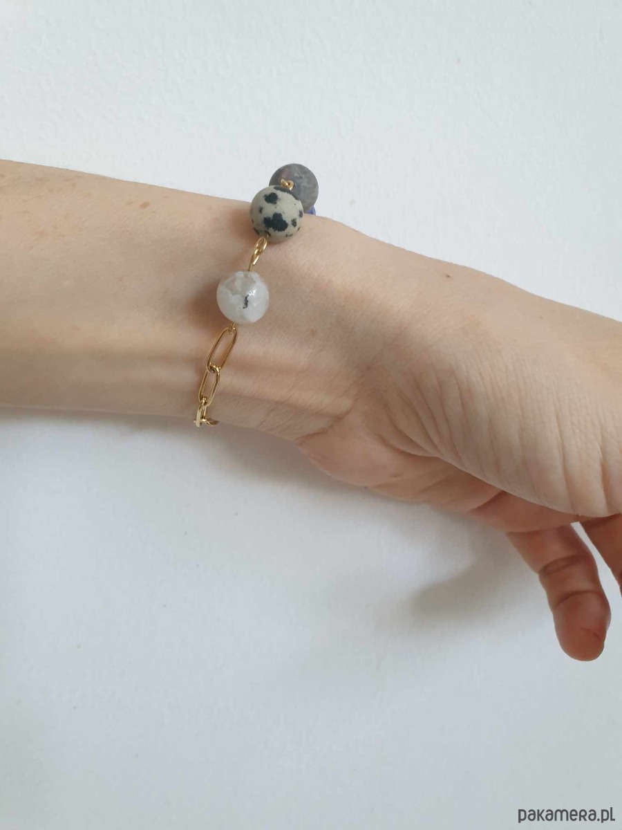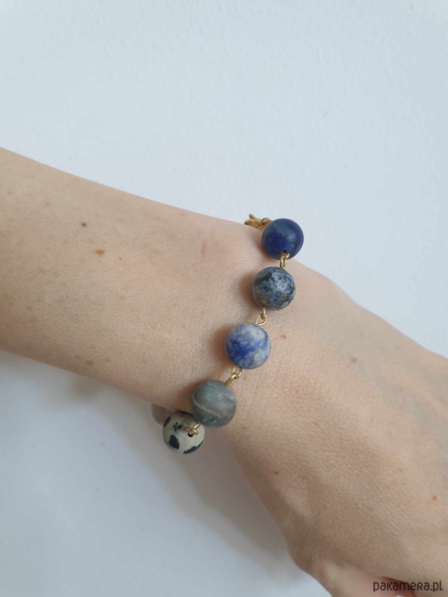 Minimalistyczna delikatna bransoletka kulki z kolekcji FANABERIA. Tworzona ręcznie z kamieni naturalnych, łańcucha i elementów ze stali szlachetnej pozłacanej (antyalergicznej) W tej - matowa kulka lapis lazuli, jaspis oceaniczny, jaspis niebieski, labradoryt, jaspis dalmatyński, kamień księżycowy