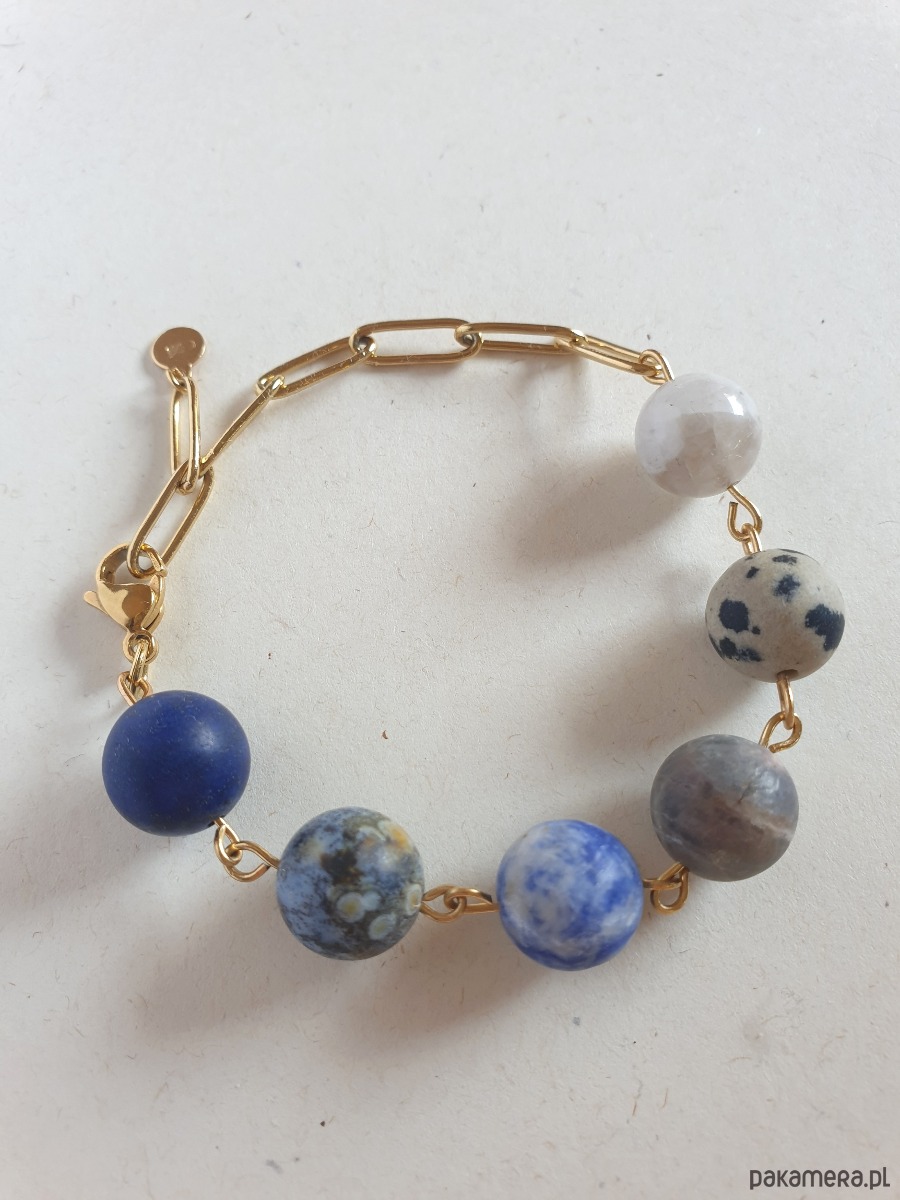 Minimalistyczna delikatna bransoletka kulki z kolekcji FANABERIA. Tworzona ręcznie z kamieni naturalnych, łańcucha i elementów ze stali szlachetnej pozłacanej (antyalergicznej) W tej - matowa kulka lapis lazuli, jaspis oceaniczny, jaspis niebieski, labradoryt, jaspis dalmatyński, kamień księżycowy