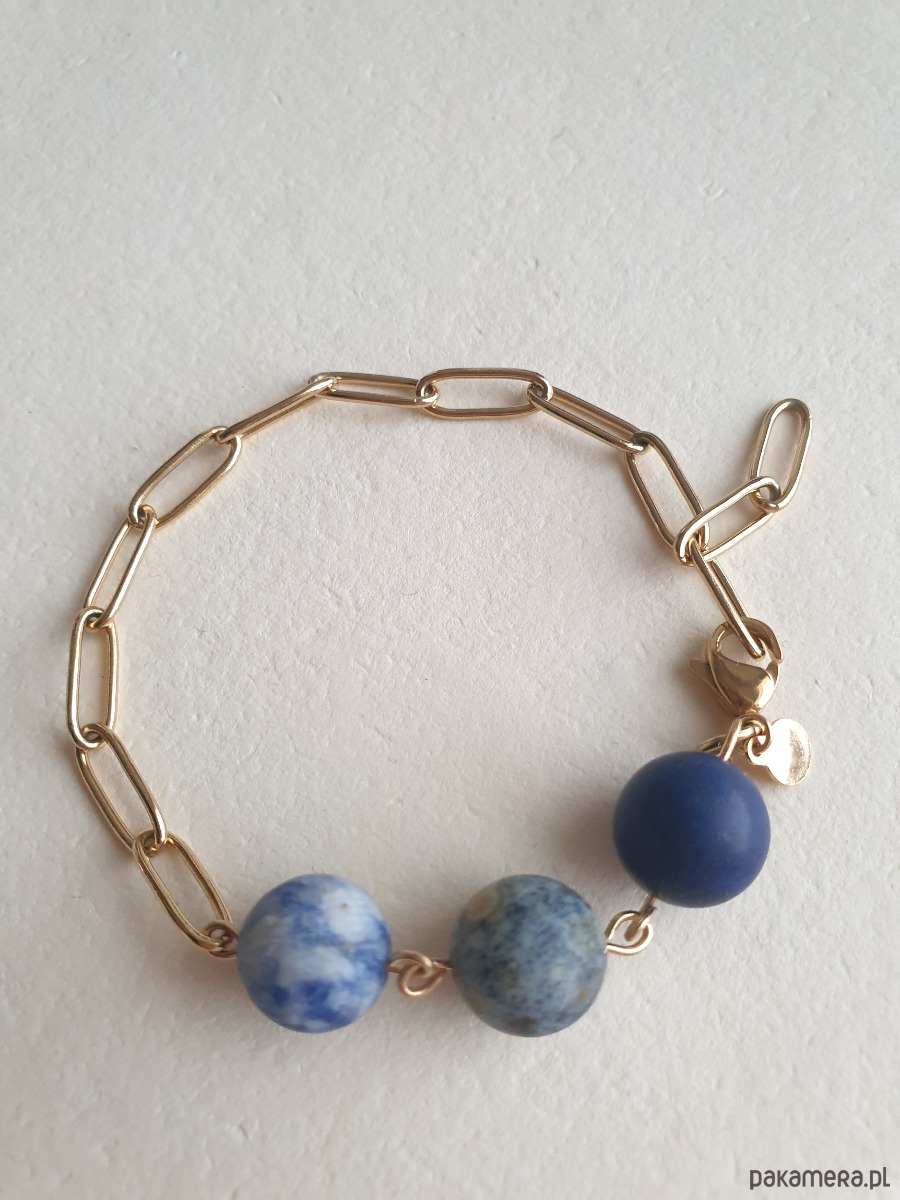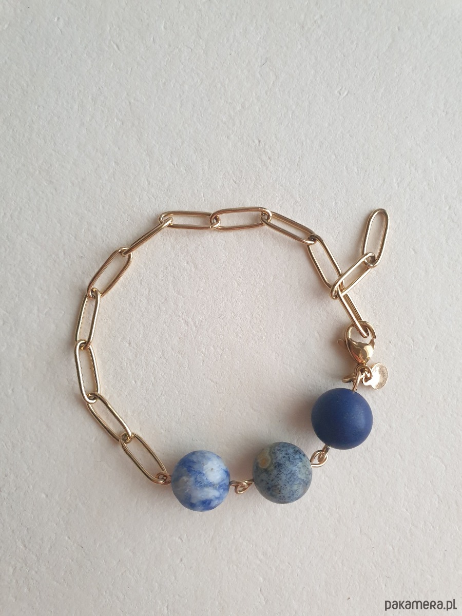 Minimalistyczna delikatna bransoletka kulki z kolekcji FANABERIA. Tworzona ręcznie z kamieni naturalnych, łańcucha i elementów ze stali szlachetnej pozłacanej (antyalergicznej) W tej - matowa kulka lapis lazuli. jaspis oceaniczny, jaspis niebieski