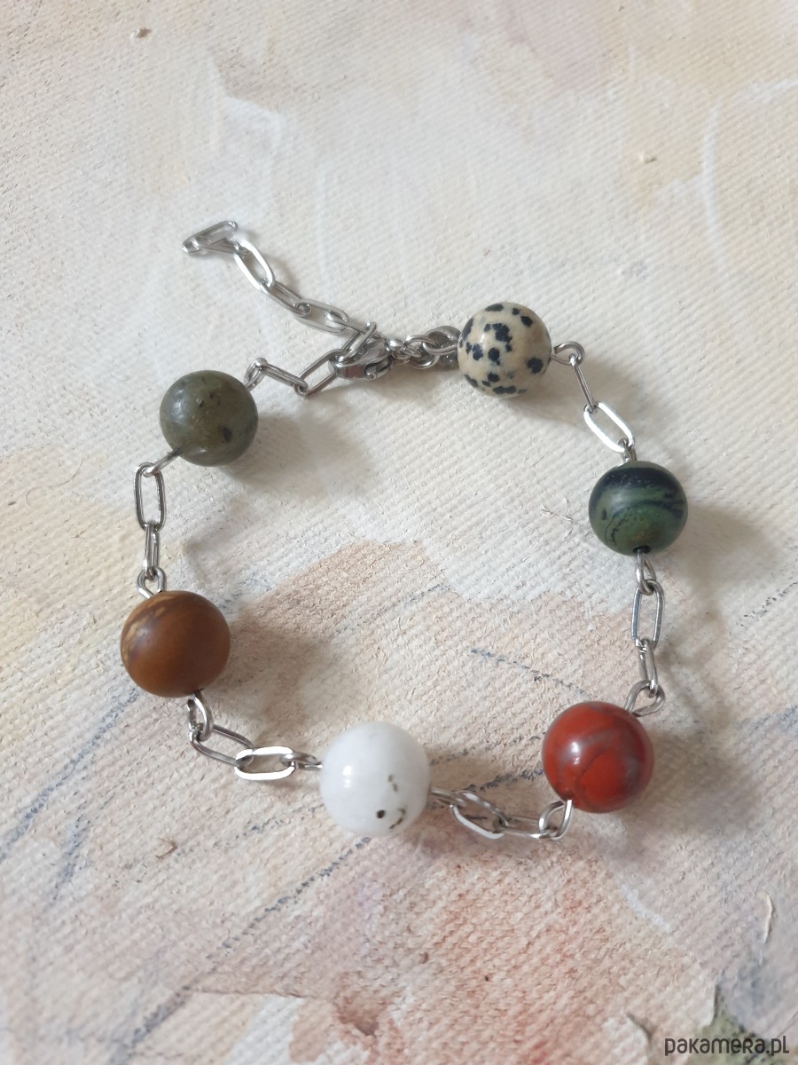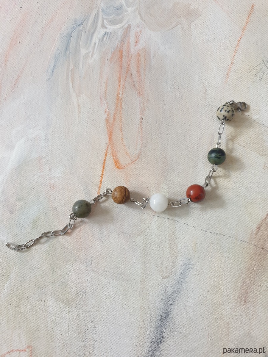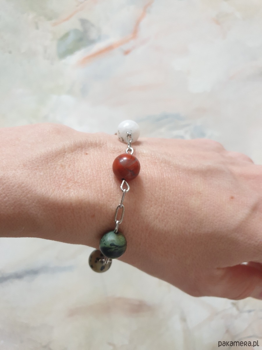 Bransoletka z łańcuszkami z kolekcji FANABERIA. Tworzona ręcznie z kamieni naturalnych, łańcucha i elementów ze stali szlachetnej (antyalergicznej) W tej – matowa kulka jaspis kambaba, jaspis obrazkowy, jaspis dalmatyński, jaspis czerwony, kamień księżycowy, labradoryt