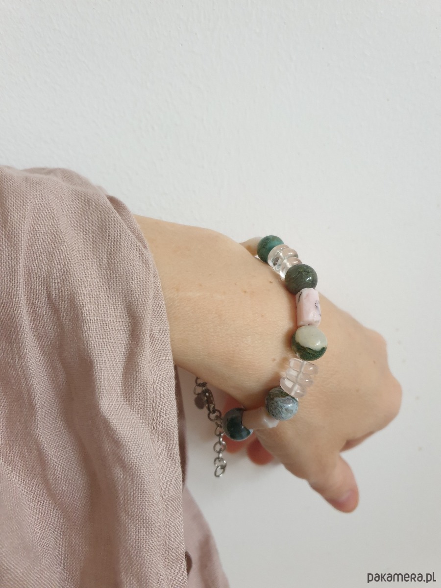 Bransoletka z kolekcji FANABERIA z dużymi kamieniami. Tworzona ręcznie z kamieni naturalnych- opal indyjski różowy, agat mszysty, kwarc różowy. Elementy ze stali szlachetnej (antyalergicznej) Bransoletka w stylu boho, idealna na lato do pastelowych stylizacji.