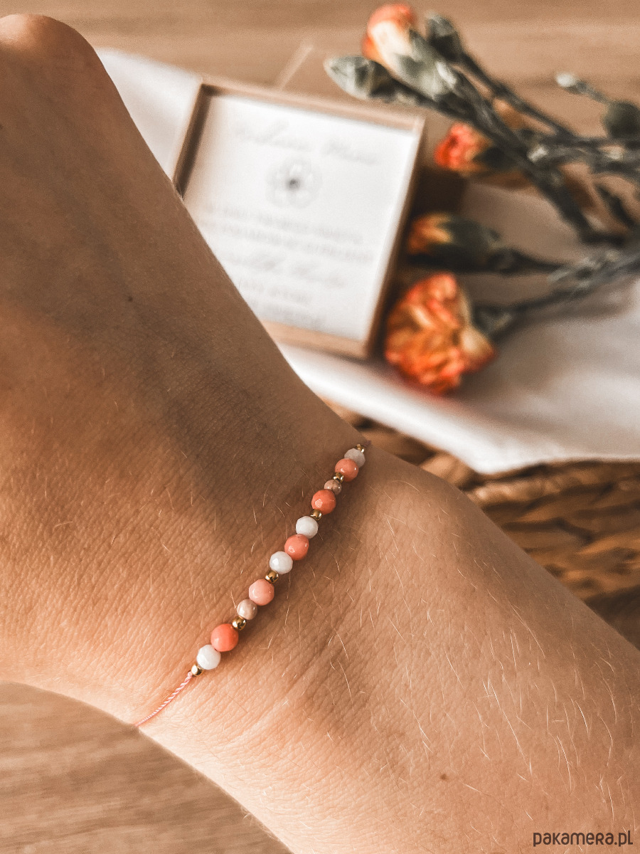 Bransoletka w wiosenno- letnich kolorach z kolekcji Flowers. Wykonana na wytrzymałej, nylonowej nici z koralu, chalcedonu, rodochrozytu oraz srebrnych koralików próby 925 pozłacanych 24K złotem. Piękne, energetyczne kolory to idealna propozycja biżuterii na wiosenny i letni czas.