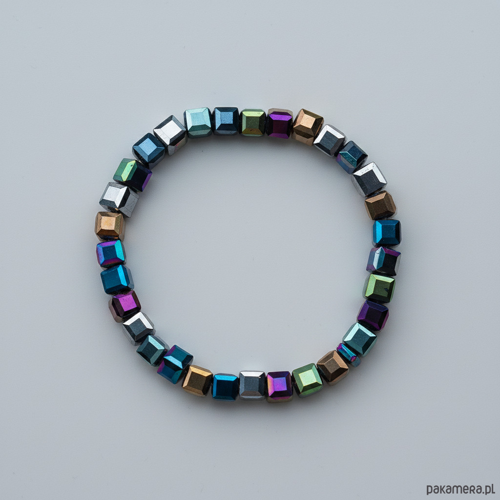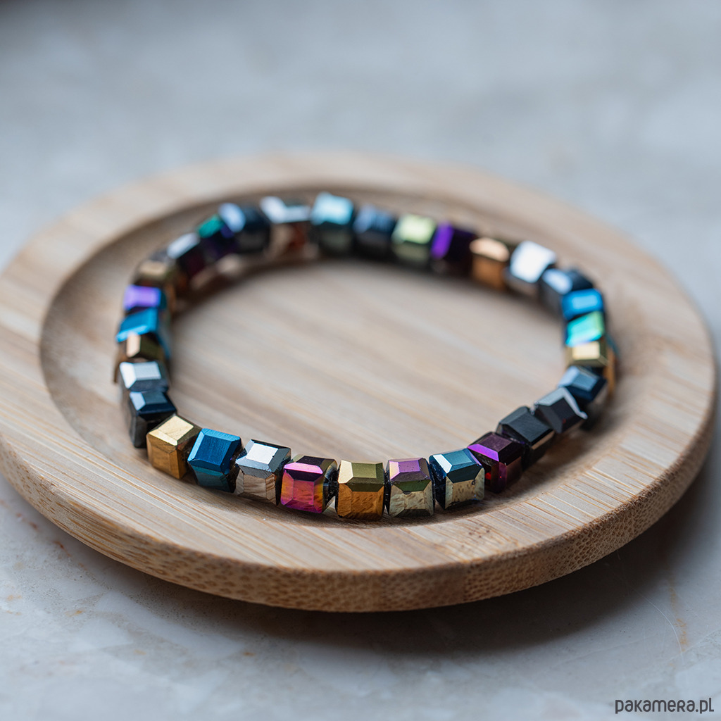 Bransoletka z ciemnych, kolorowych, kwadratowych koralików. Oryginalny dodatek o geometrycznym charakterze, który pasuje zarówno do codziennych, jak i wieczorowych stylizacji.