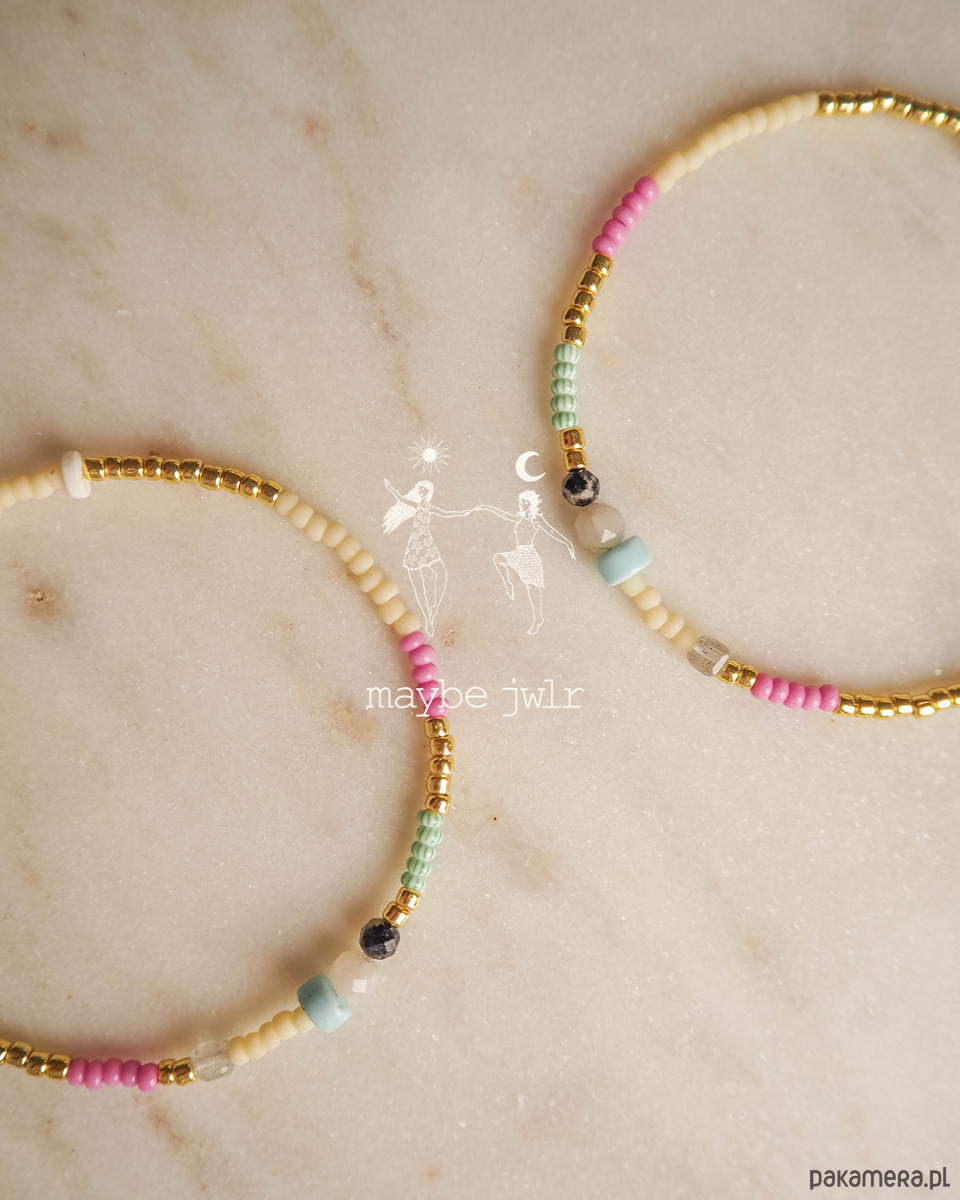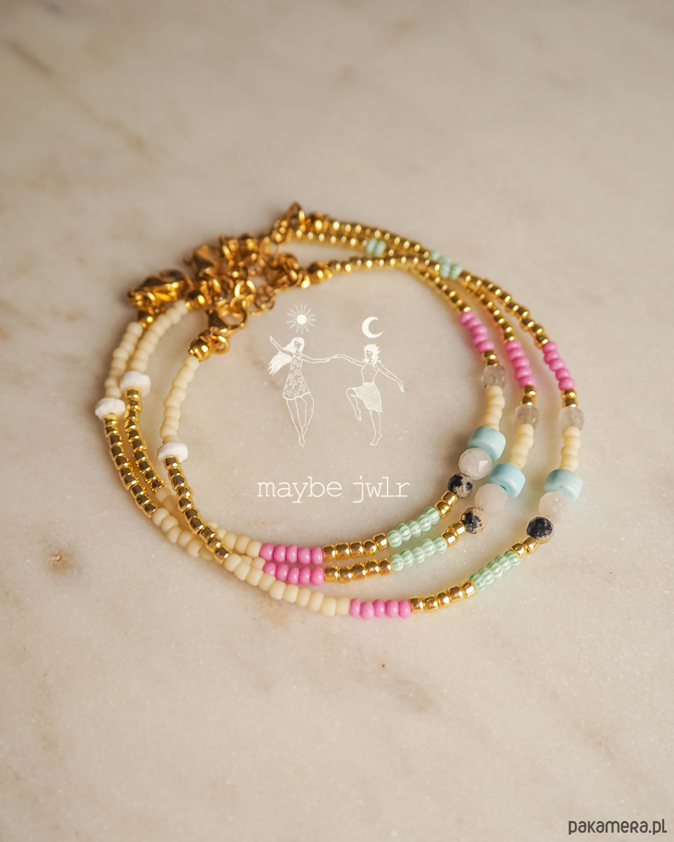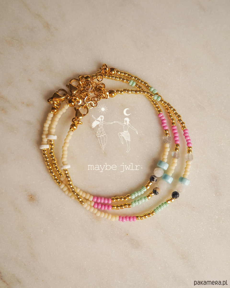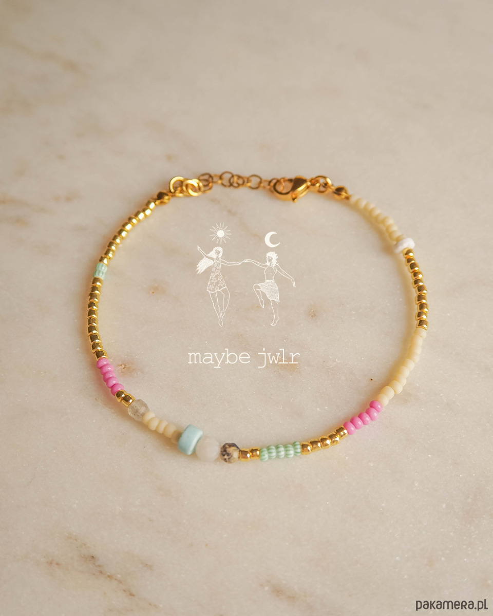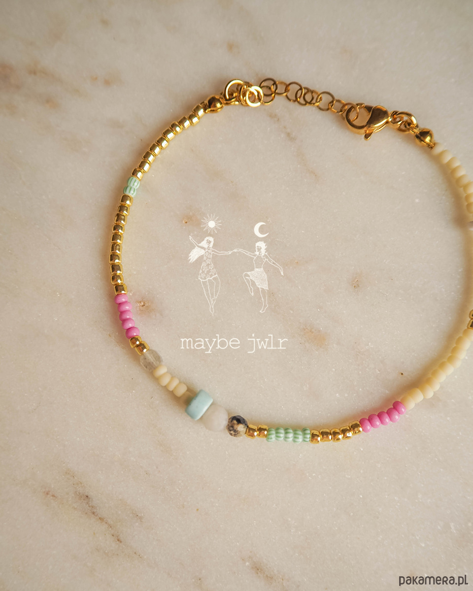 Gini została stworzona ręcznie z wysokiej jakości materiałów. Ta ciekawa bransoletka jest zrobiona z drobnych i szklanych koralików Toho oraz selekcjonowanych kamieni naturalnych : muszla, howlit, kamień księżycowy, jaspis dalmatyński.