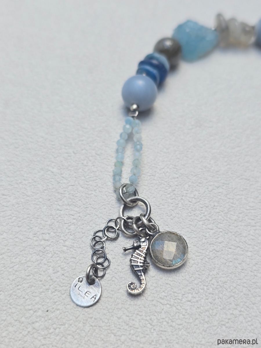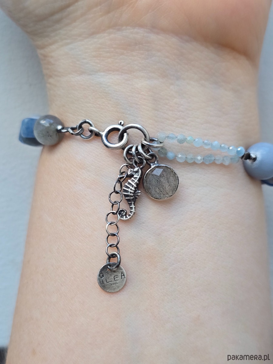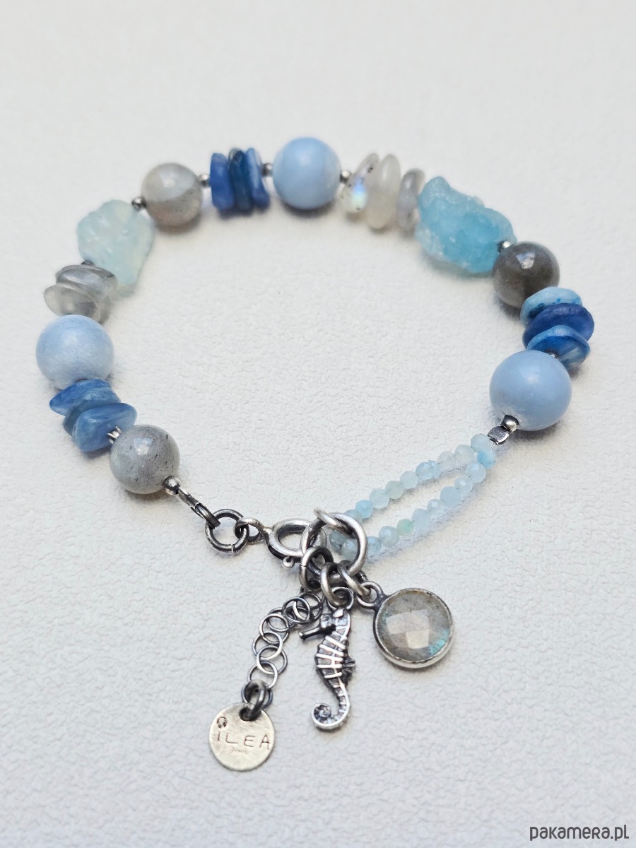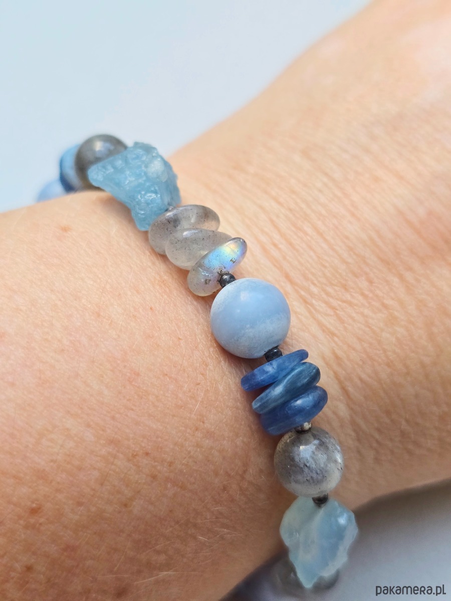 Unikatowa bransoletka z zawieszkami. Wykonana z kamieni naturalnych w przedziale wielkosci od 2mm do 10mm tj.: kyanit, angelit, akwamaryn, labradoryt