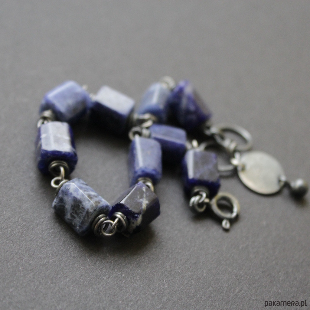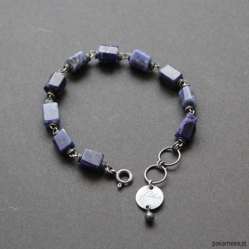 Bransoletka została wykonana z oksydowanego srebra próby 925 oraz pięknych granatowych sodalitów wielkości 0,7-0,9 cm.