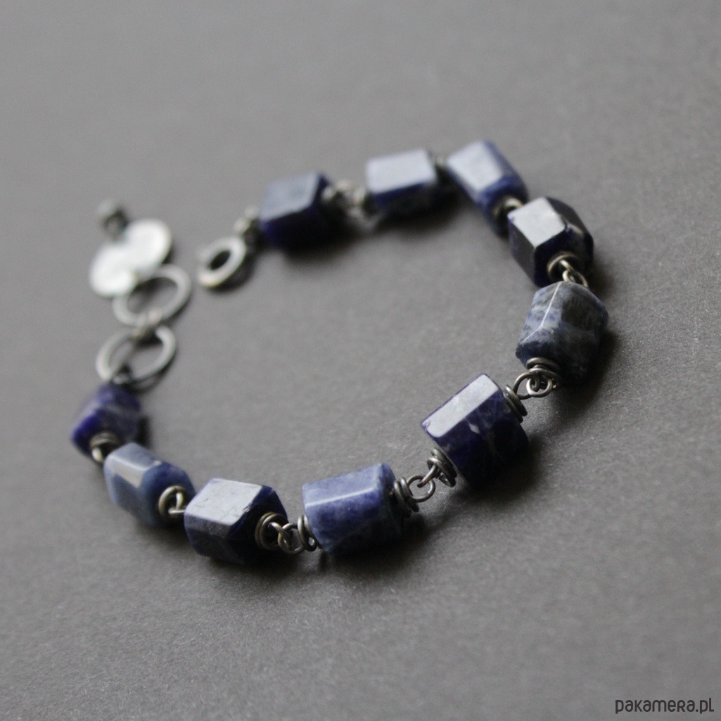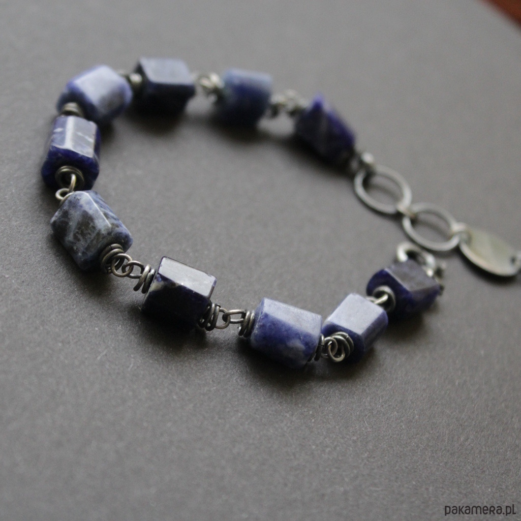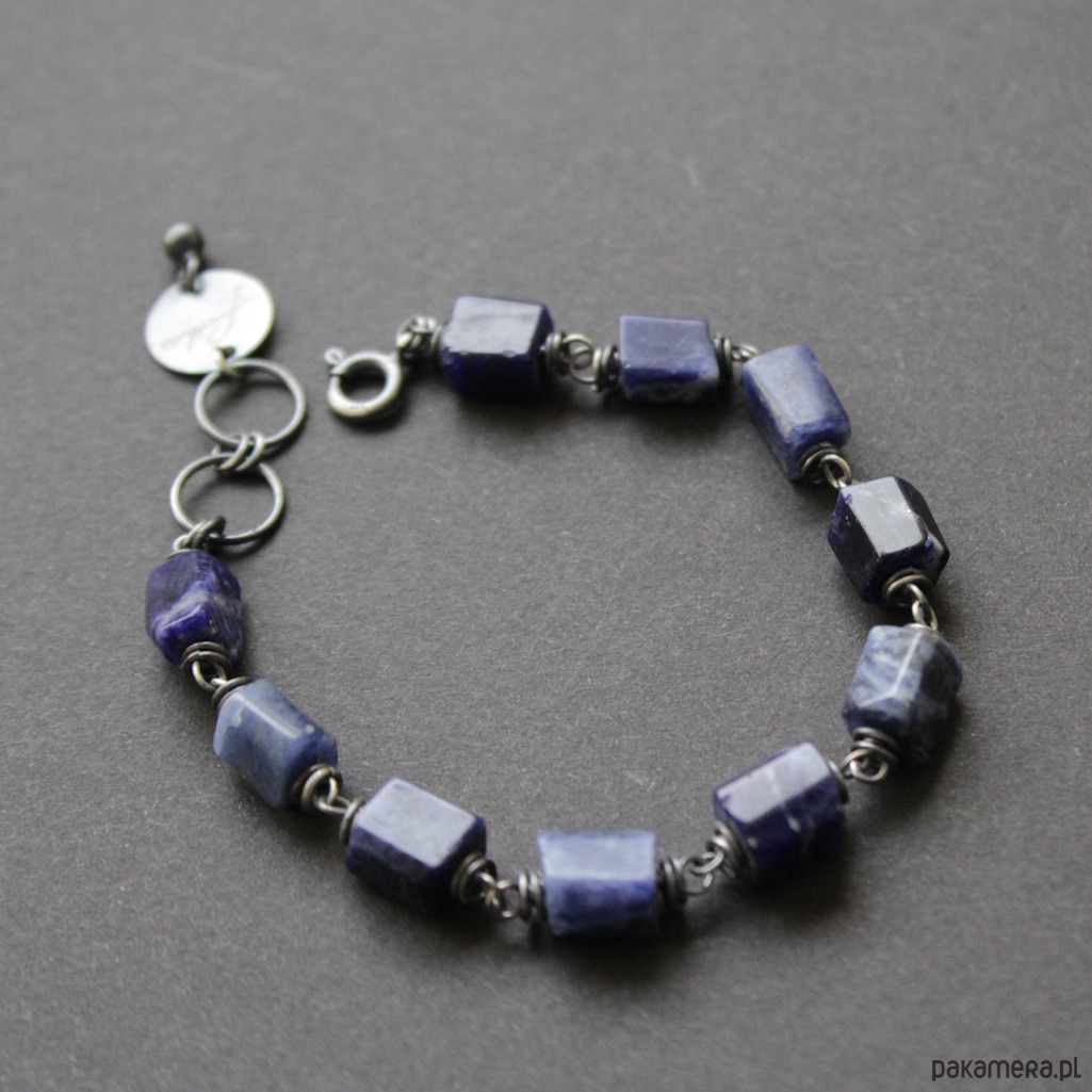 Bransoletka została wykonana z oksydowanego srebra próby 925 oraz pięknych granatowych sodalitów wielkości 0,7-0,9 cm.