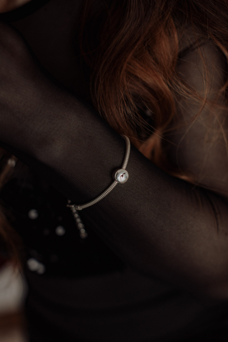 Bransoletka nie posiada stoperów, dzięki czemu koralik swobodnie przesuwa się po jej długości, nadając biżuterii lekkości.