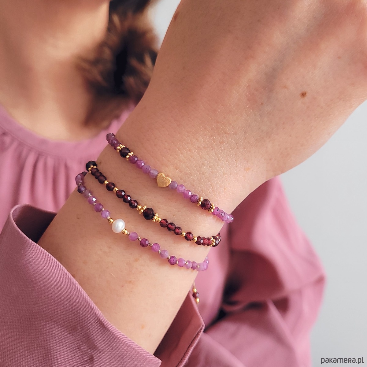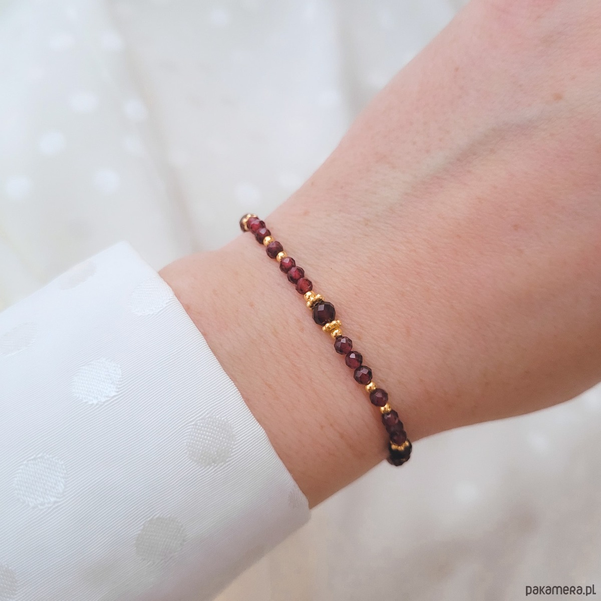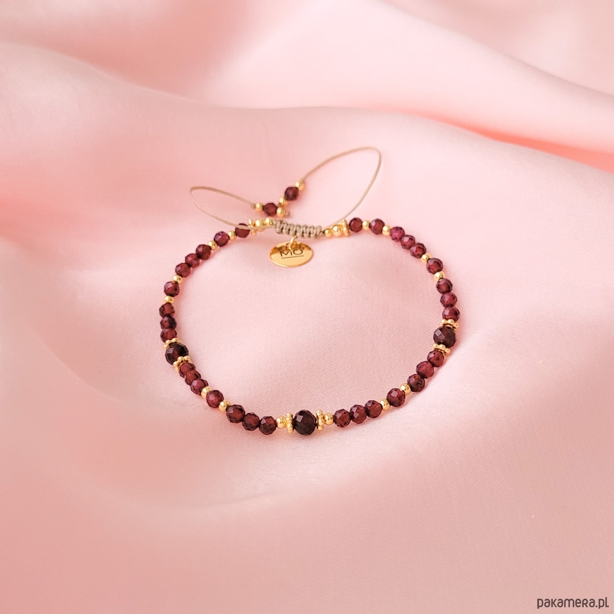 Elegancka bransoletka z fasetowanego granatu i srebra pozłacanego. Minerały umocowane są na mocnym sznurku jubilerskim w kolorze cielistym. Sznurek posiada wygodne zapięcie w postaci makramy, które umożliwia regulację wielkości bransoletki, dzięki czemu będzie dobra na każdy nadgarstek. Przy zapięciu umieściliśmy ozdobną blaszkę z logo MiO sasso wykonaną ze srebra pozłacanego.