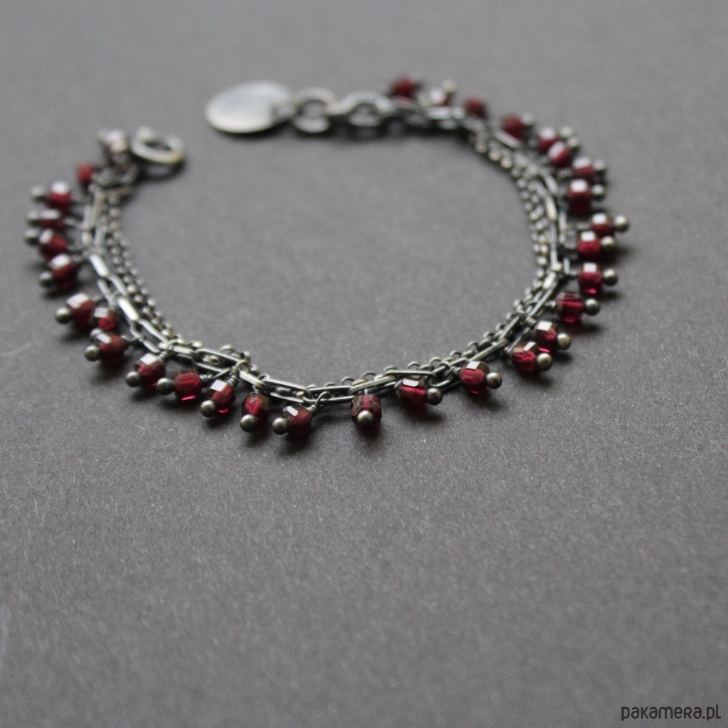 Bransoletka wykonana została z oksydowanego srebra próby 925 oraz przepięknych, wysokiej jakości fasetowanych granatów wielkości 0,3 cm.