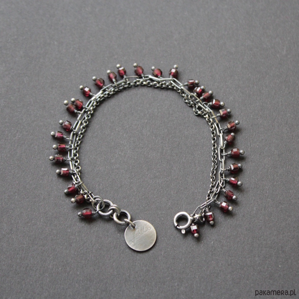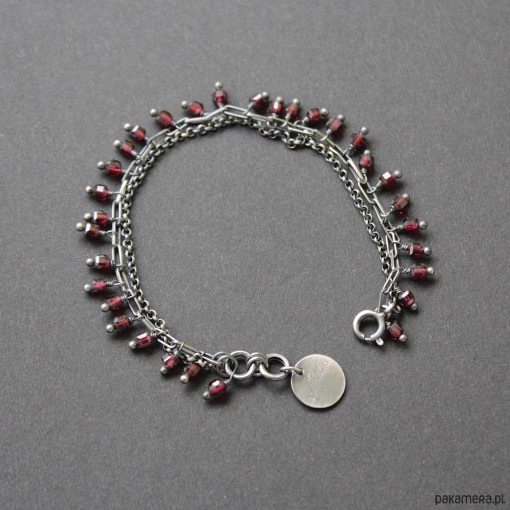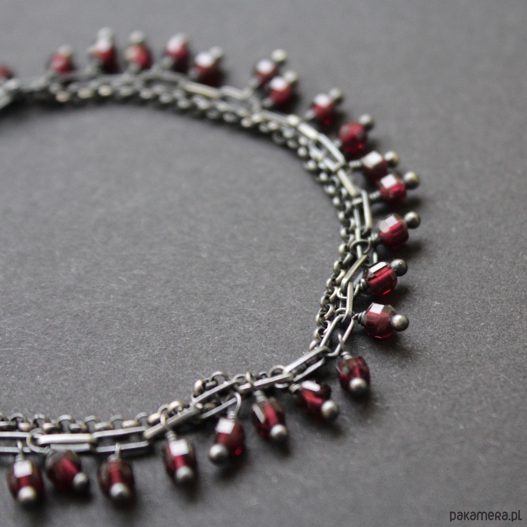 Bransoletka wykonana została z oksydowanego srebra próby 925 oraz przepięknych, wysokiej jakości fasetowanych granatów wielkości 0,3 cm.