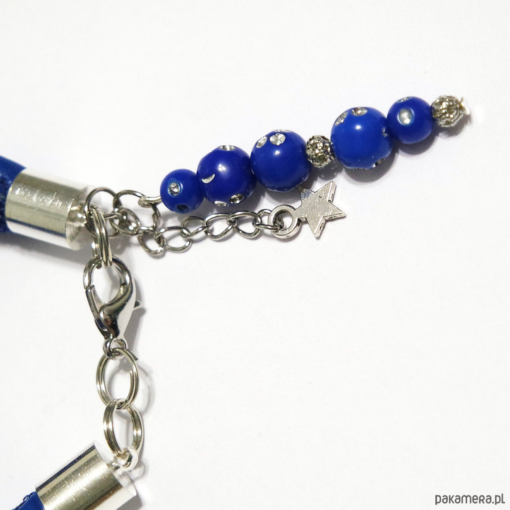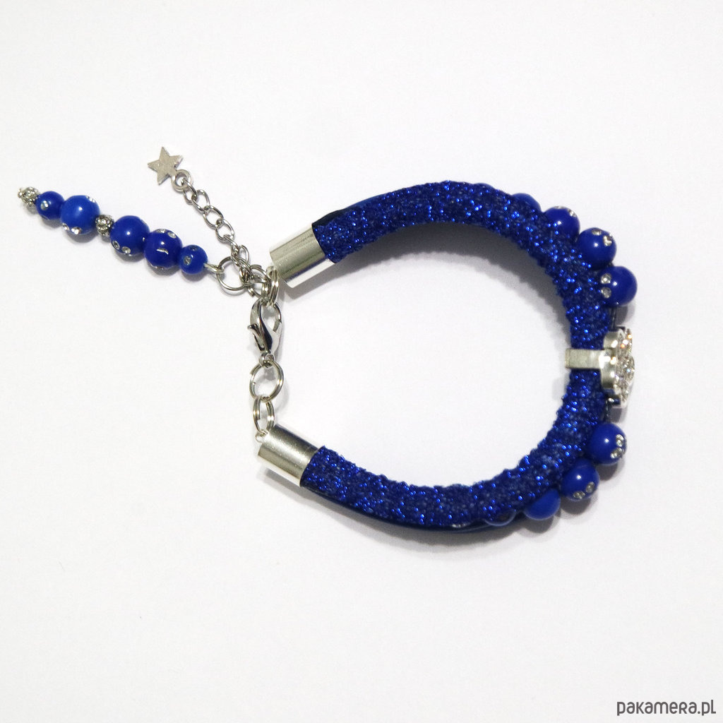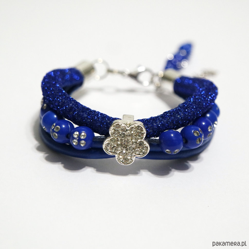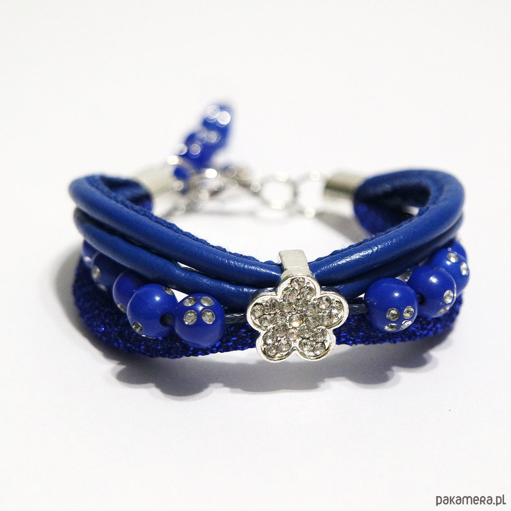 Bransoletka zrobiona jest z rzemieni z materiału, eko skóry i sznurka oraz przekładki z błyszczącymi kryształkami i koralików.