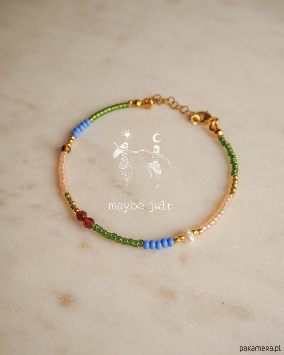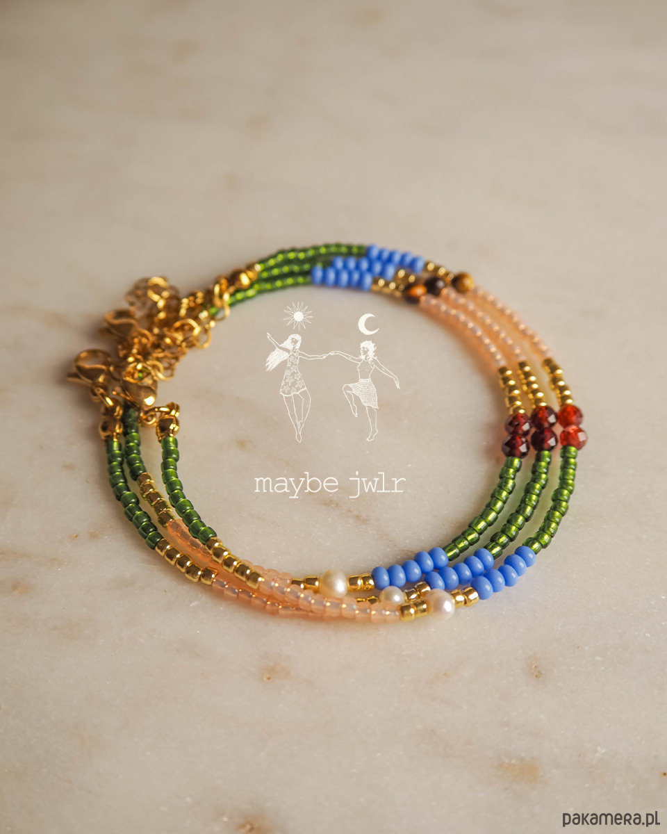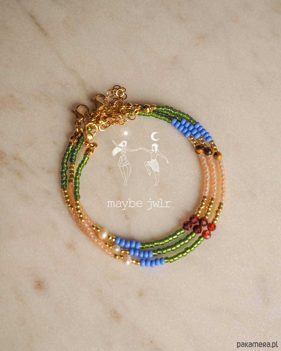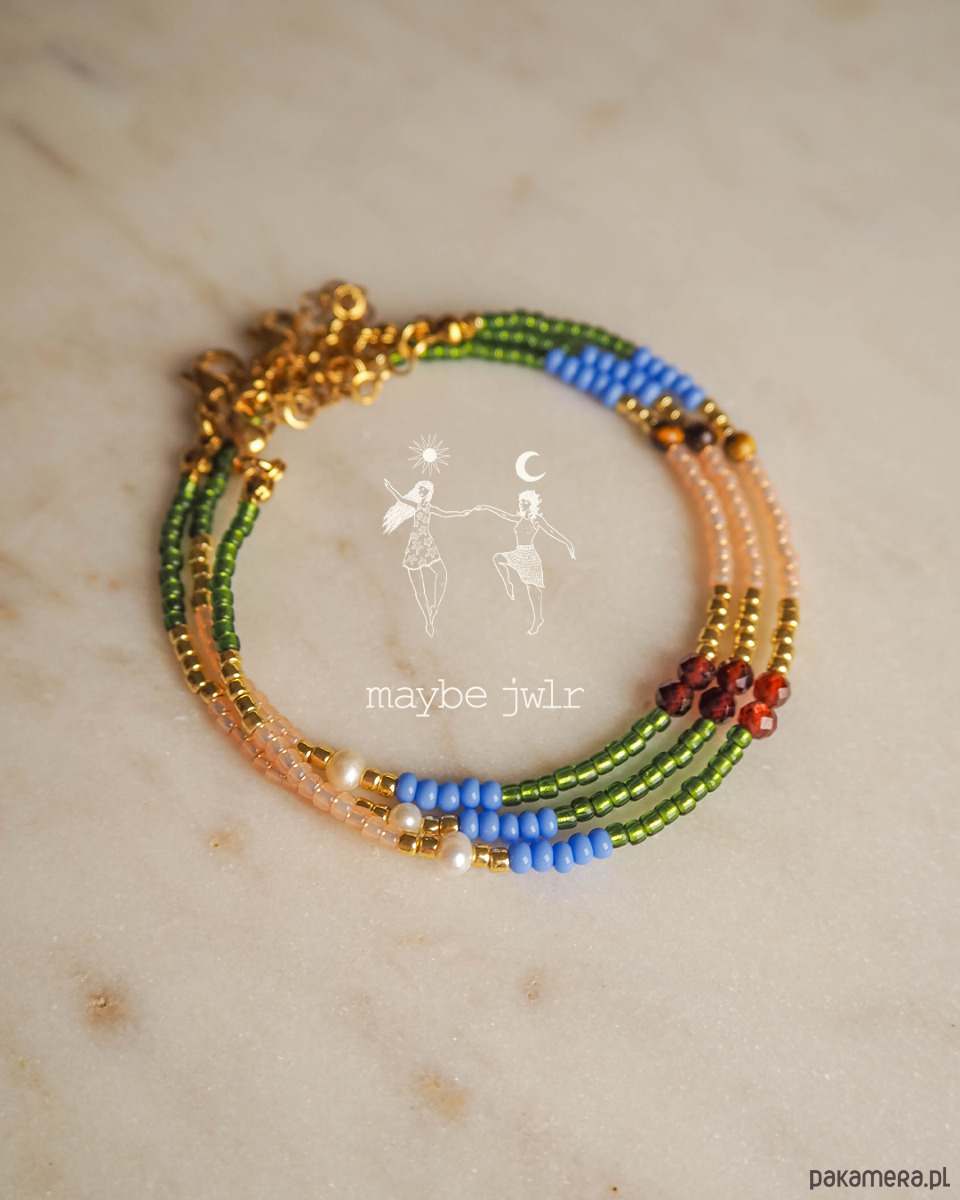 Grass została stworzona ręcznie z wysokiej jakości materiałów. Ta ciekawa bransoletka jest zrobiona z drobnych i szklanych koralików Toho oraz selekcjonowanych kamieni naturalnych : oko tygrysie, granat, perła.