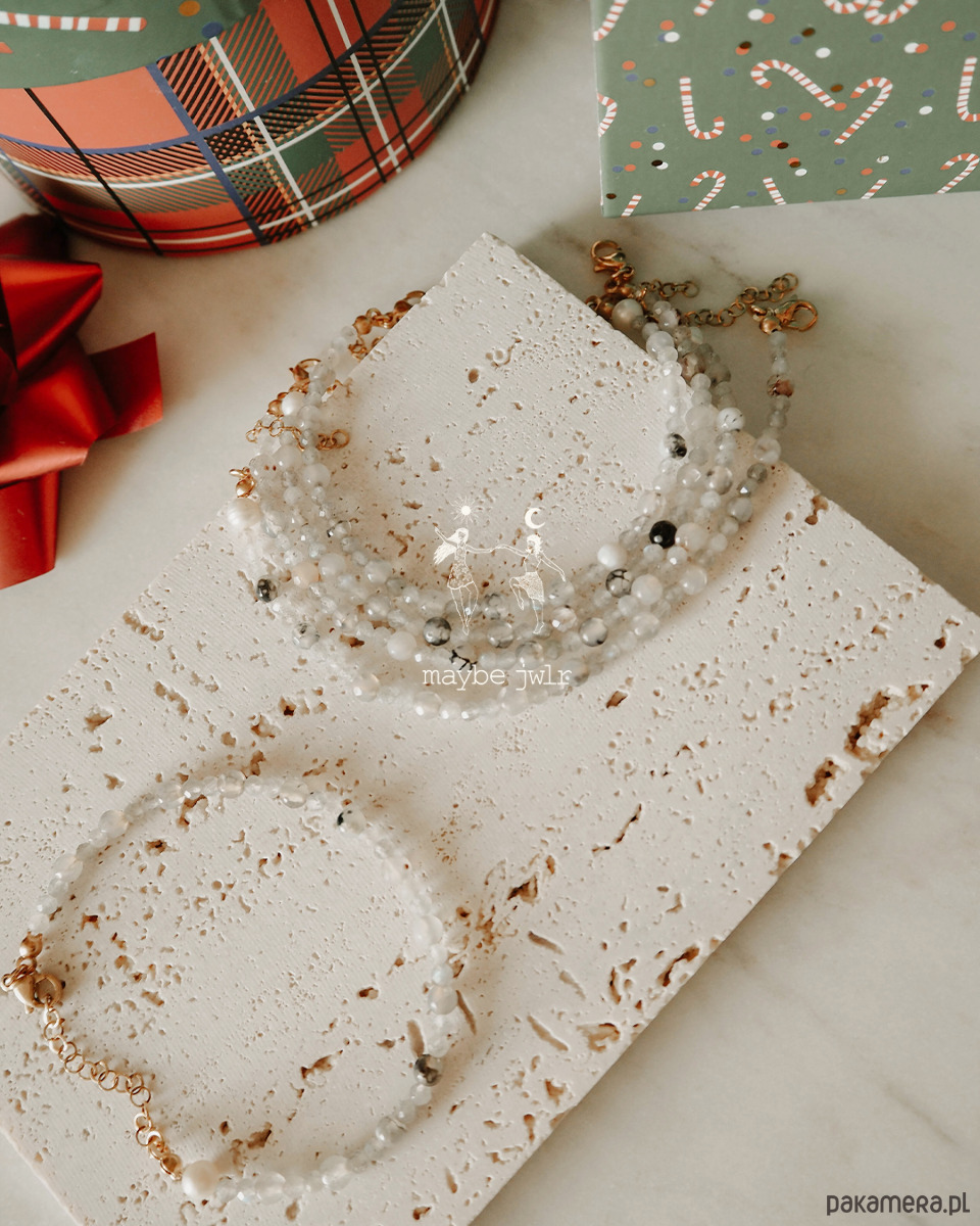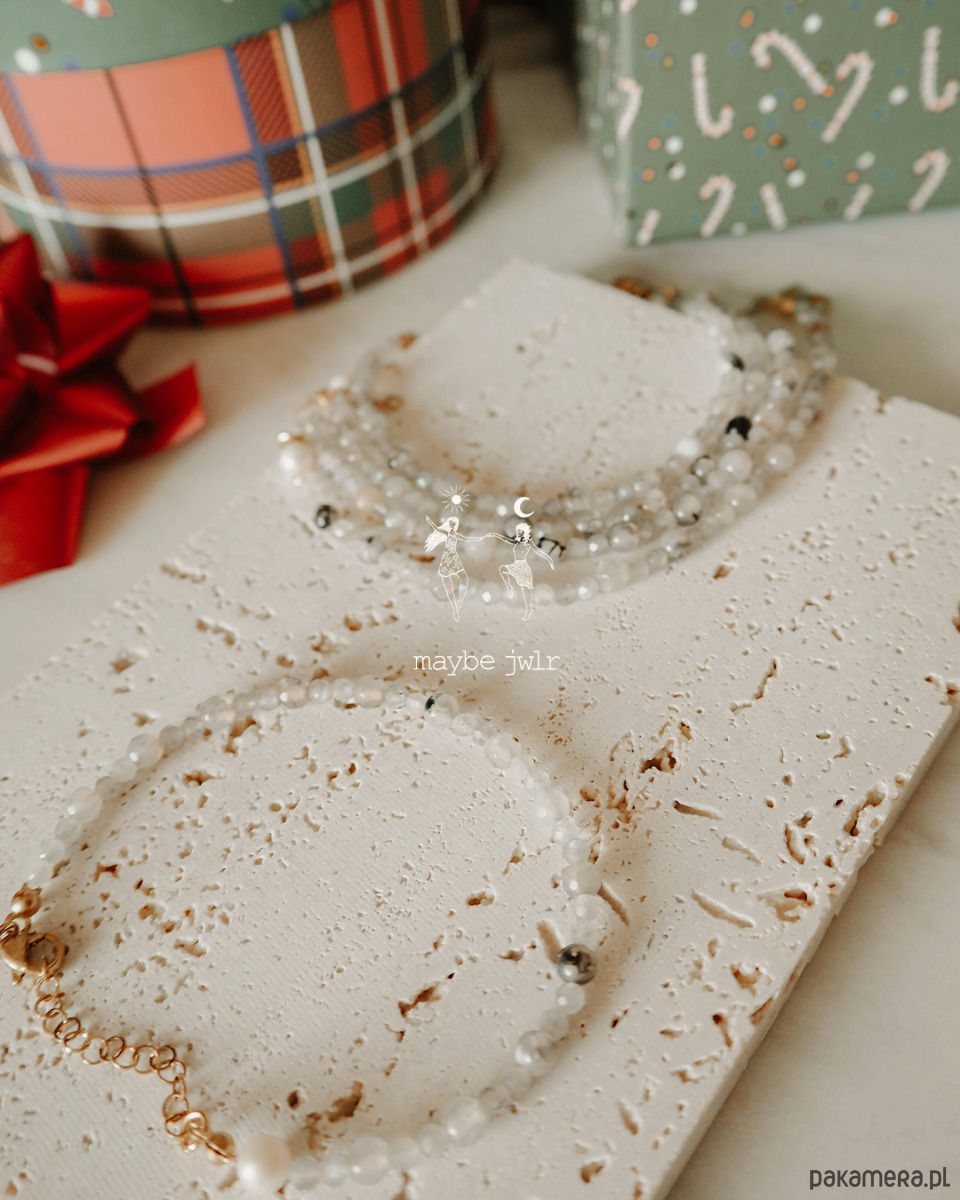 Ta delikatna bransoletka została stworzona z drobnych kamieni labradorytu i szarego agatu o wielkości 3 i 4 mm, które pięknie migoczą niczym zorza na nocnym niebie. Większe, mlecznoszare kamienie z subtelnymi, czarnymi plamkami nadają kompozycji naturalnej głębi i lekkości. Całość dopełnia trwałe zapięcie ze stali szlachetnej oraz wygodna przedłużka.