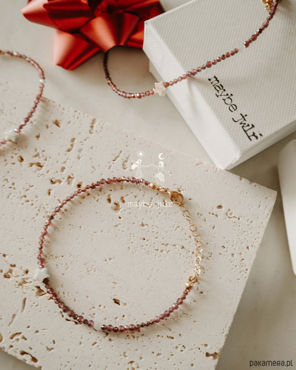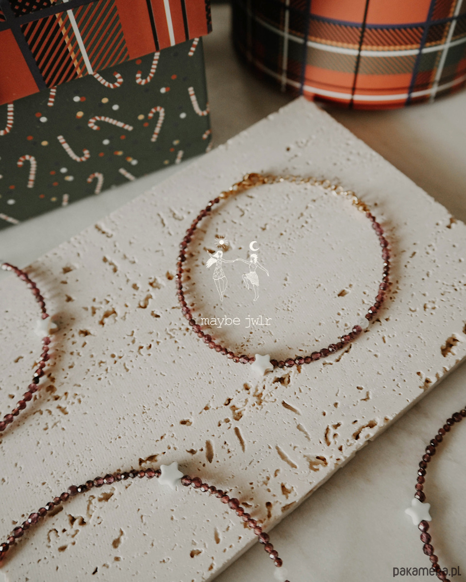 Ta wyjątkowo subtelna bransoletka została stworzona z drobnych, 2-milimetrowych kamieni granatu oraz błękitnego jaspisu cesarskiego w kształcie gwiazdki. Delikatnie połyskujące fasetki kamieni mienią się niczym gwiazdy na zimowym niebie, tworząc lekką, świąteczną kompozycję pełną magii i światła. Całość dopełnia zapięcie ze stali szlachetnej oraz wygodna przedłużka.