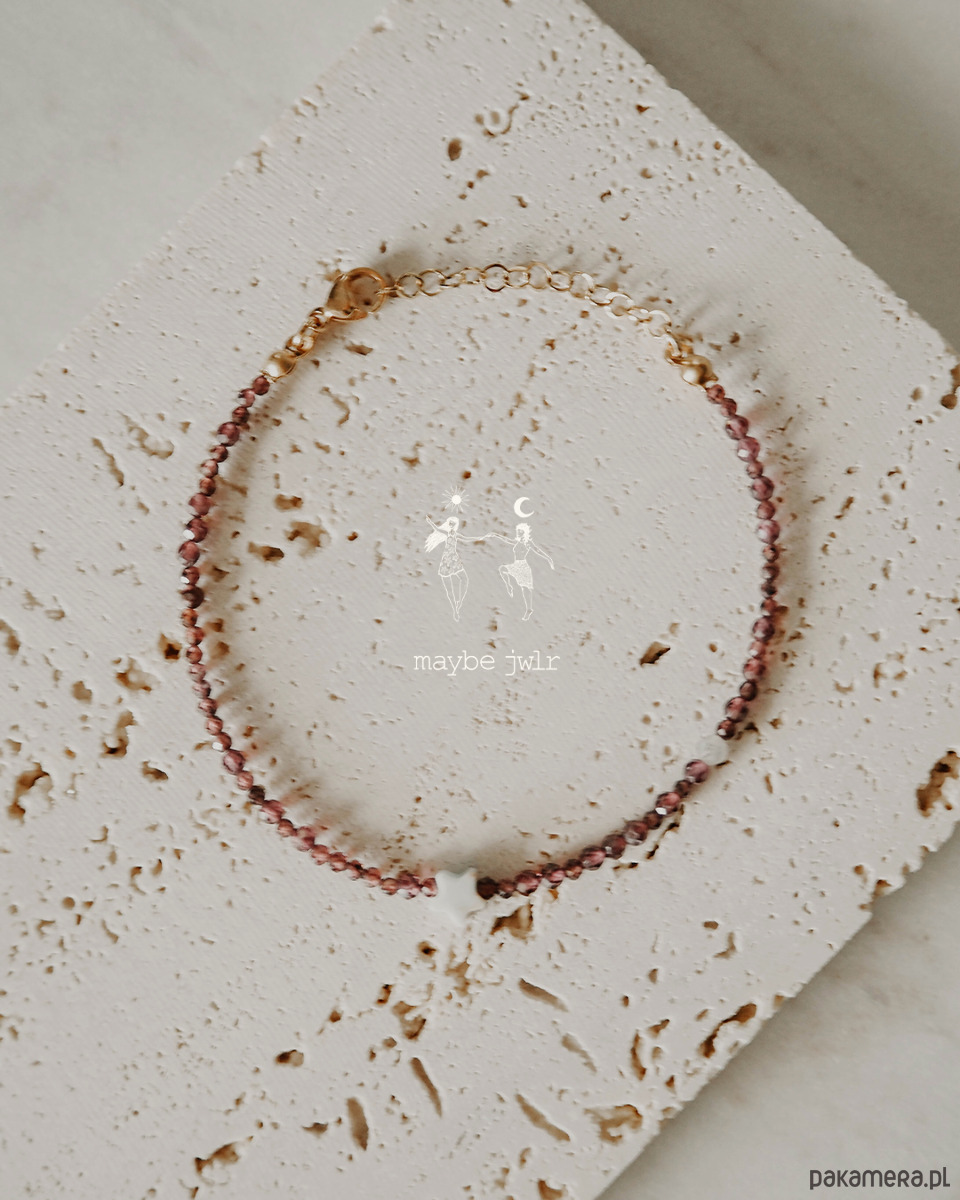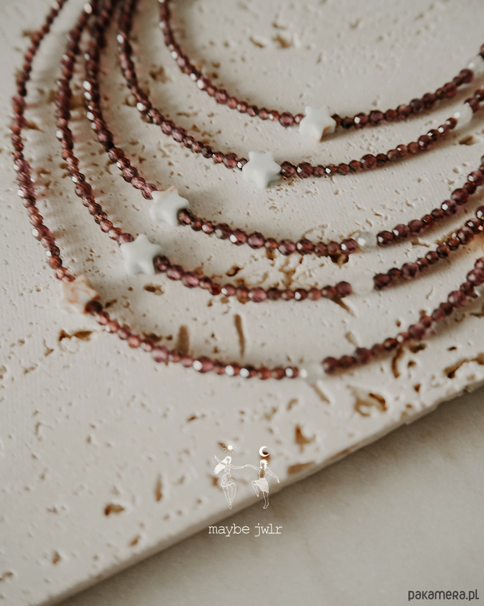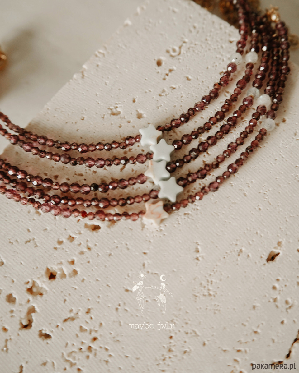 Ta wyjątkowo subtelna bransoletka została stworzona z drobnych, 2-milimetrowych kamieni granatu oraz błękitnego jaspisu cesarskiego w kształcie gwiazdki. Delikatnie połyskujące fasetki kamieni mienią się niczym gwiazdy na zimowym niebie, tworząc lekką, świąteczną kompozycję pełną magii i światła. Całość dopełnia zapięcie ze stali szlachetnej oraz wygodna przedłużka.