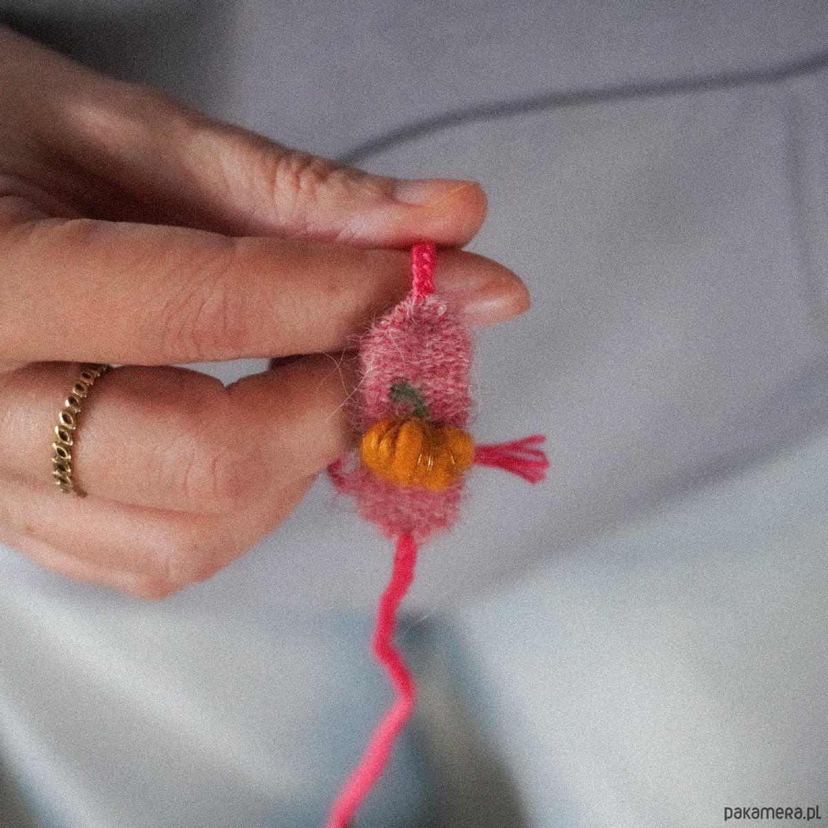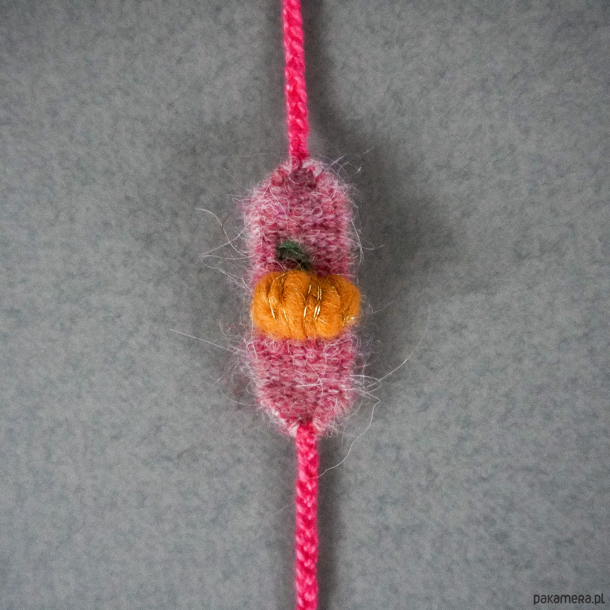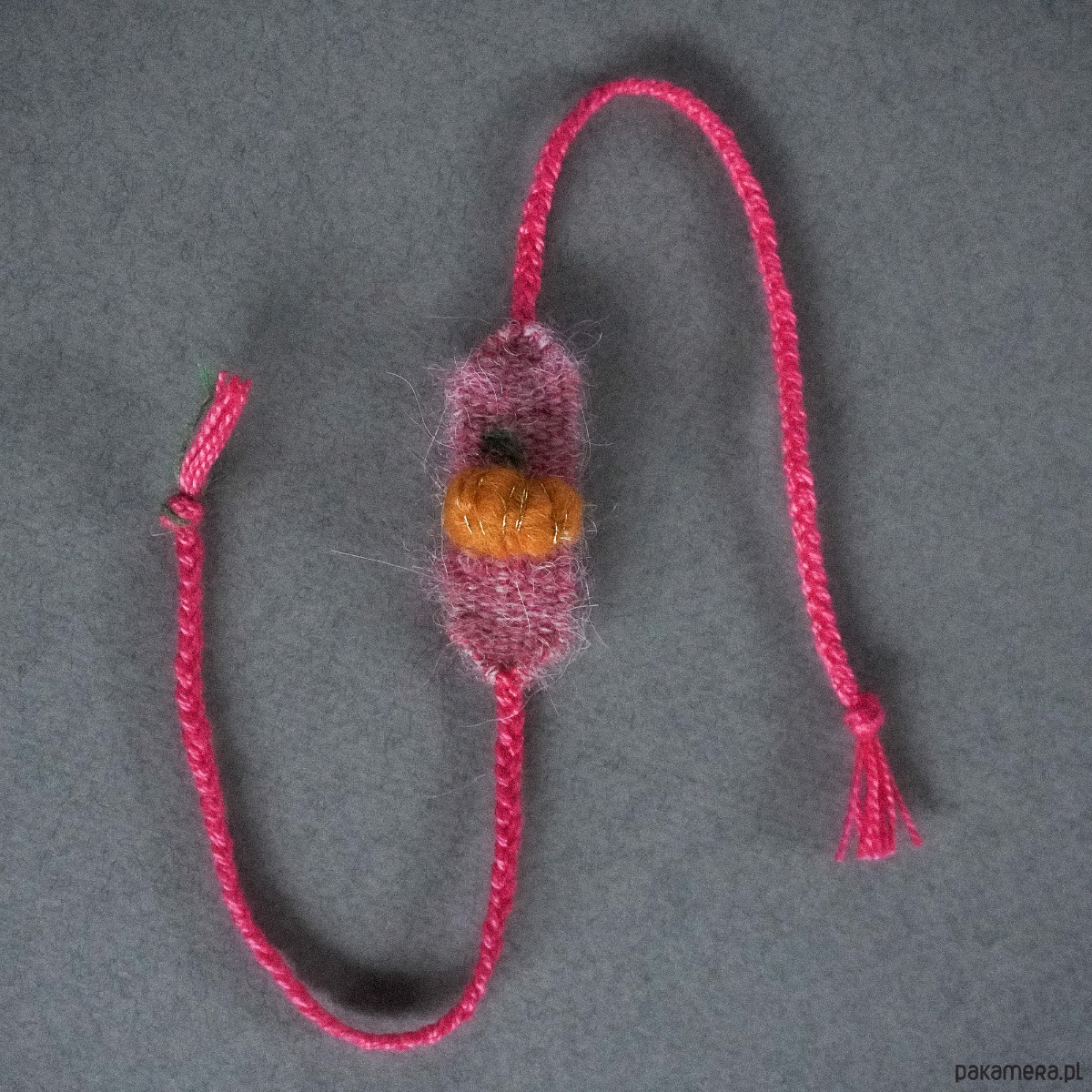 Mini bransoletka, wykonana w całości ręcznie, tkana i haftowana z dynią 3D 😉. Część tkana ma około 4 cm długości, około 1 cm szerokości. Bransoletkę wiążemy samodzielnie, dość mocno na supełek.