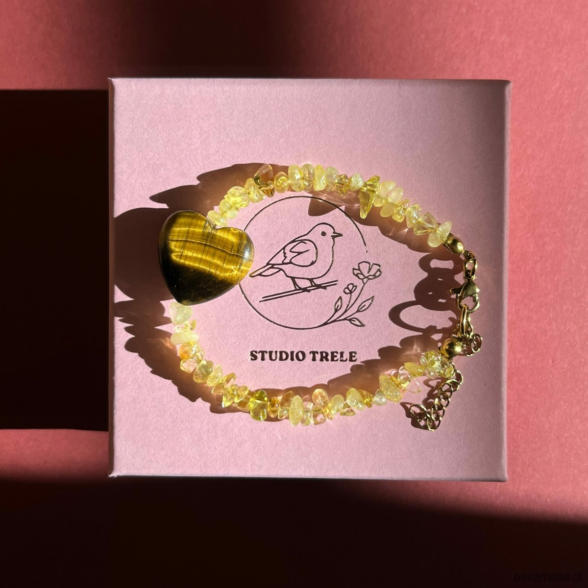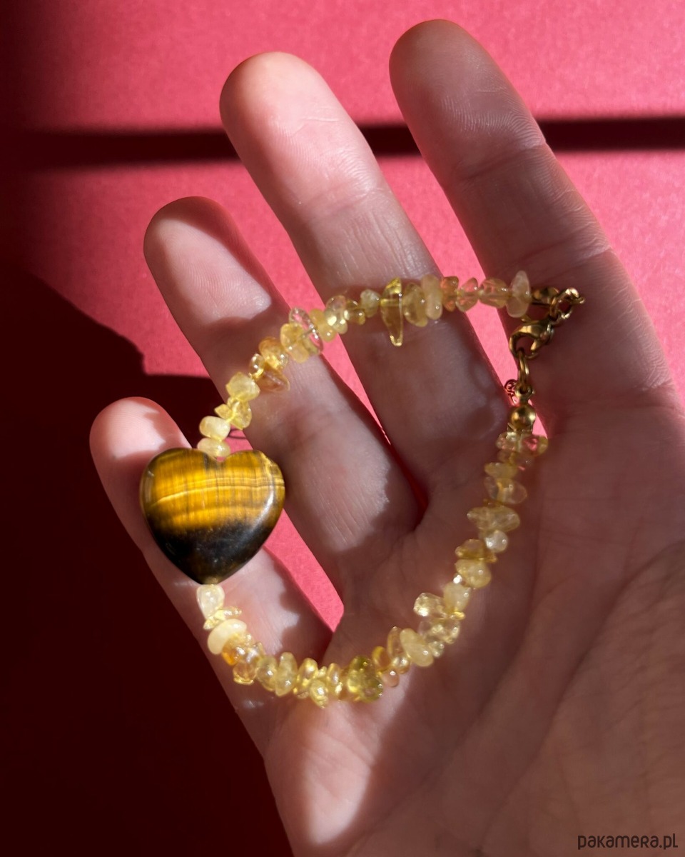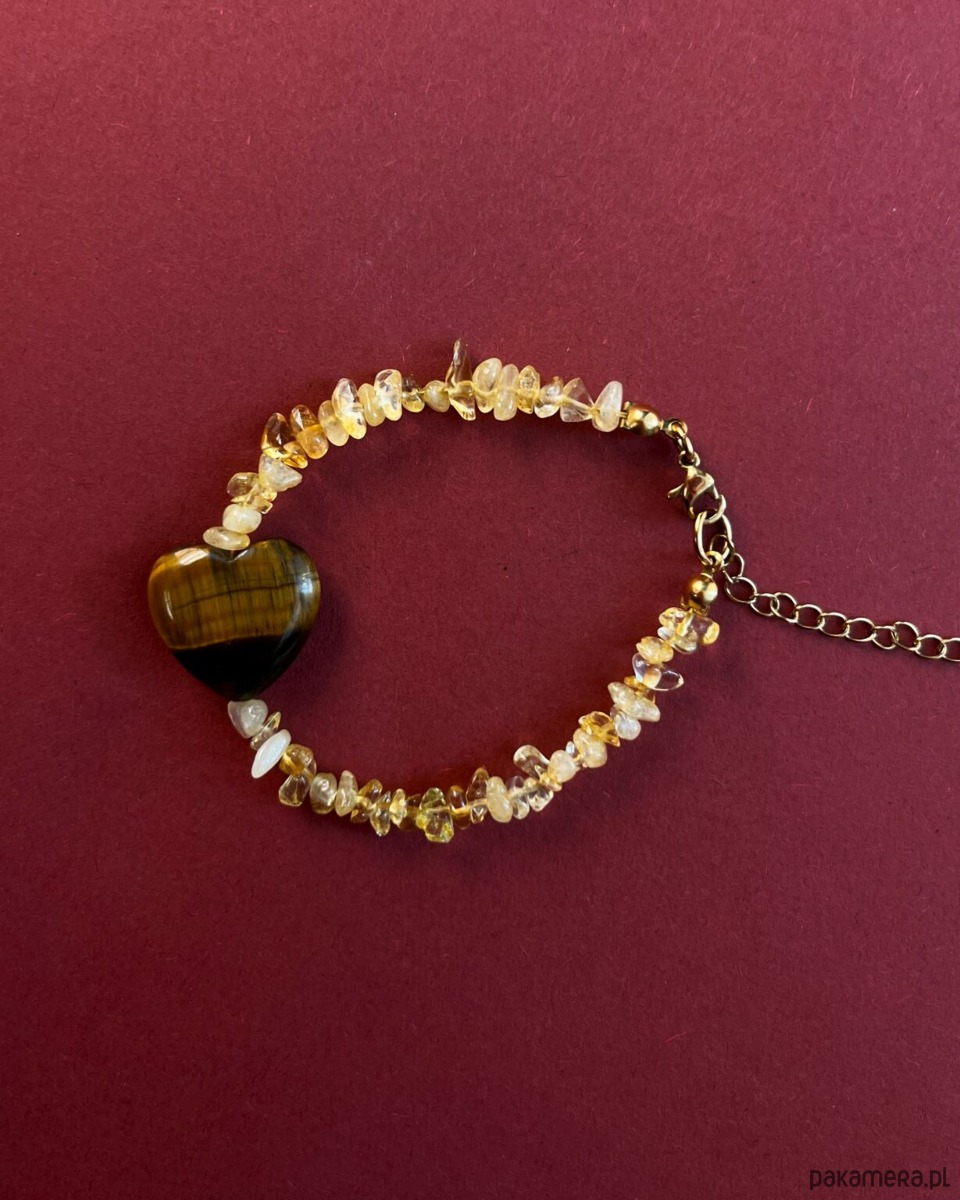 Bransoletka Halo to subtelny blask zaklęty w złocistych kamieniach cytrynu. Każdy z nieregularnych kamieni odbija światło, tworząc na skórze delikatną, ciepłą poświatę. W centrum kompozycji znajduje się serce z tygrysiego oka