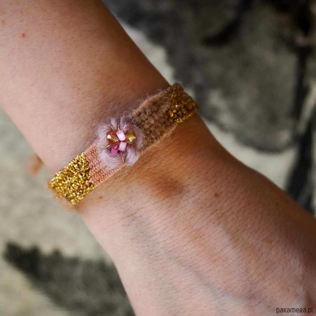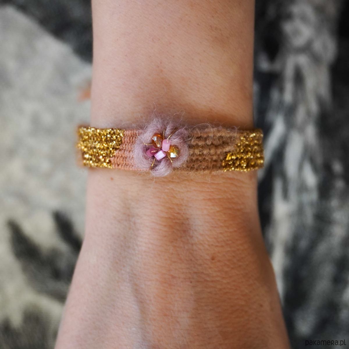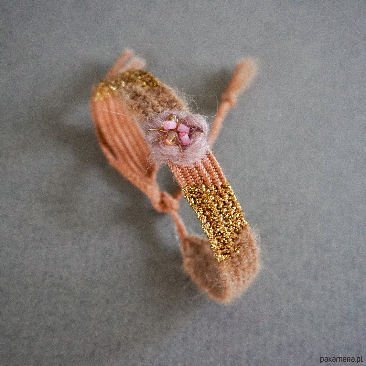 Bransoletka tkana na krosnie - unikat. Niezwykłe połączenie faktur nici i technik wykonania tworzą niesamowity efekt. Szerokość części tkanej to niecałe 1,5 cm, długość części tkanej to około 14, 15 cm. Bransoletkę wiąże się samodzielnie na supełek. Polecam gorąco♡. Bransoletki są estetycznie zapakowane, więc idealnie nadają się na prezent.