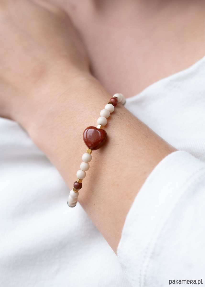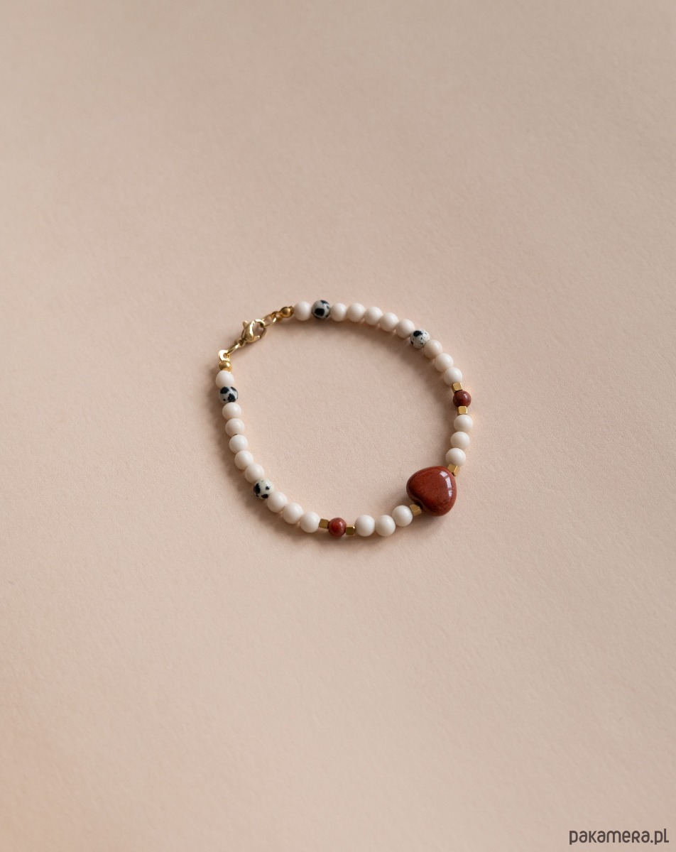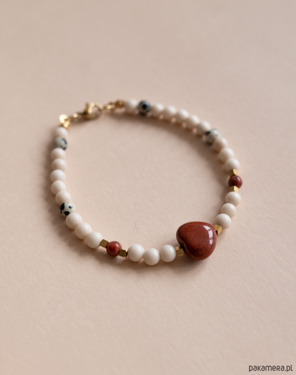 Delikatna, ręcznie wykonana bransoletka z naturalnych kamieni rzecznych, uzupełniona serduszkiem z jaspisu.