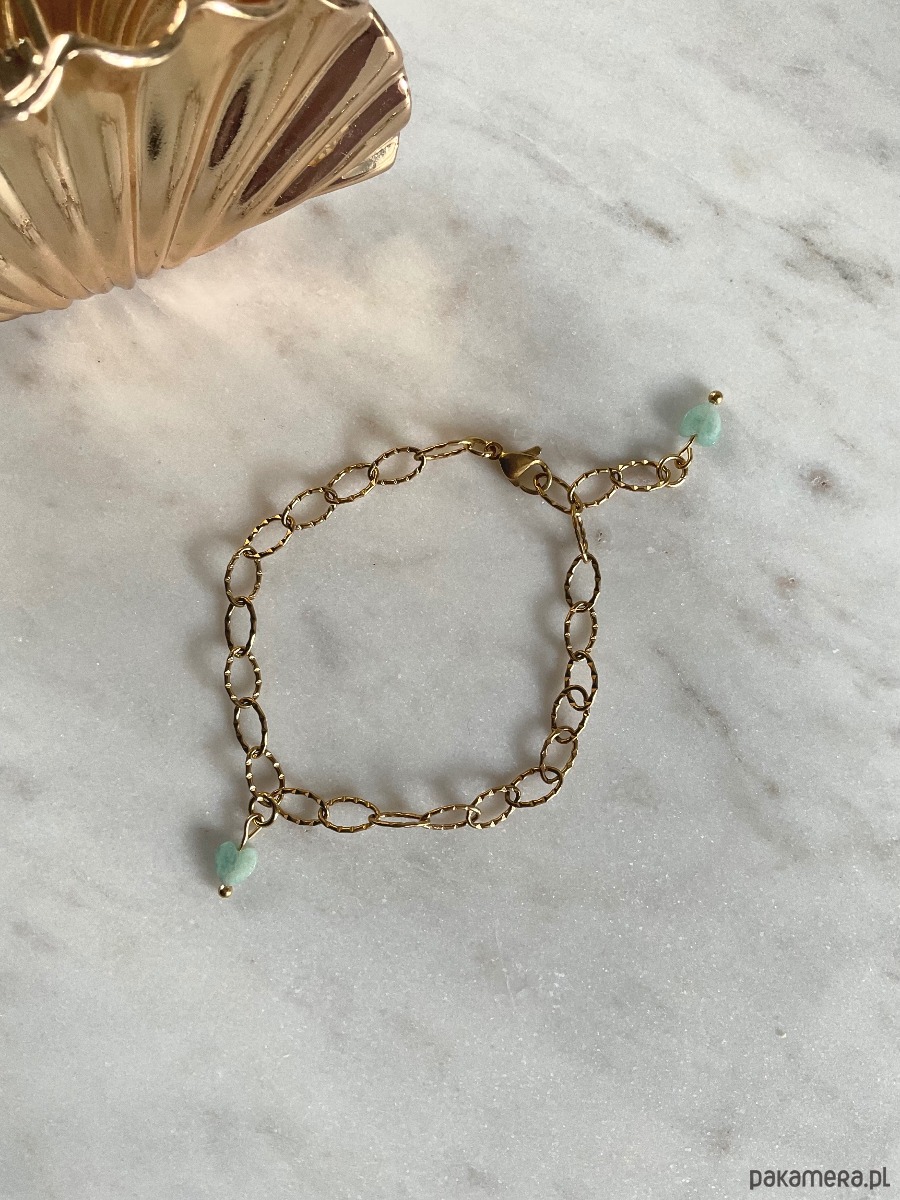 Elegancka bransoletka kobieca z ozdobnego łańcuszka o karbowanej powierzchni z zawieszkami serca z amazonitu.