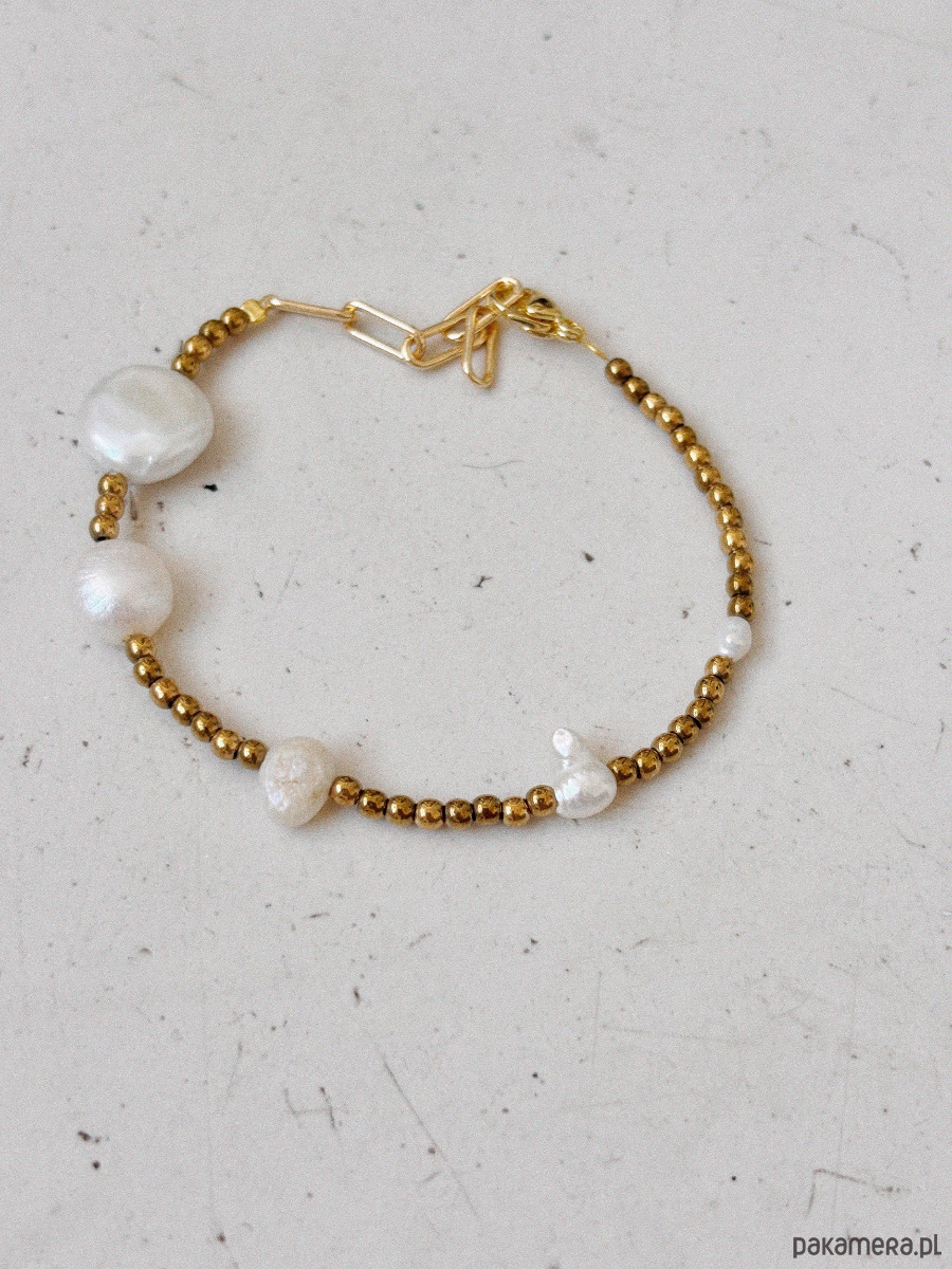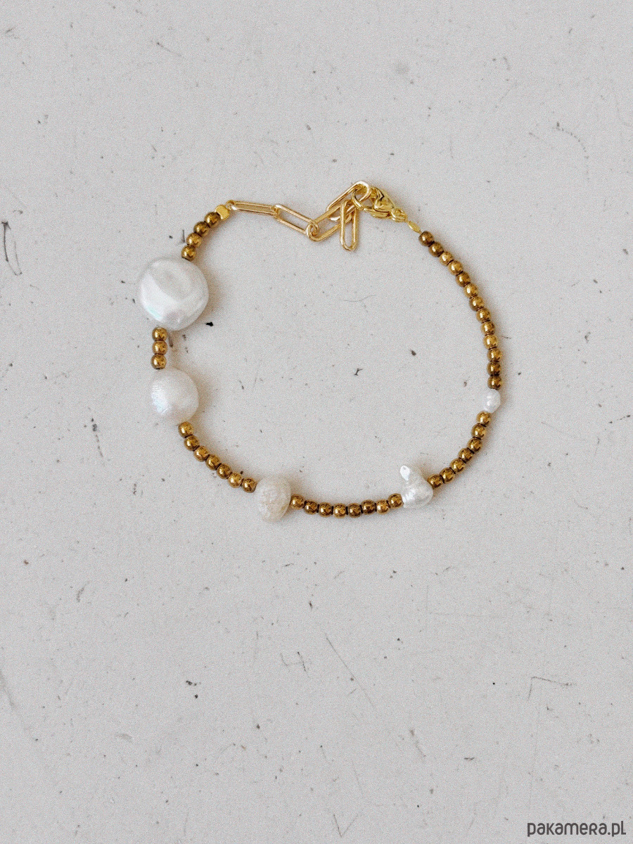 Bransoletka wykonana jest na lince jubilerskiej z użyciem hematytu, pereł naturalnych oraz zapięcia i łańcuszka ze stali ch.
