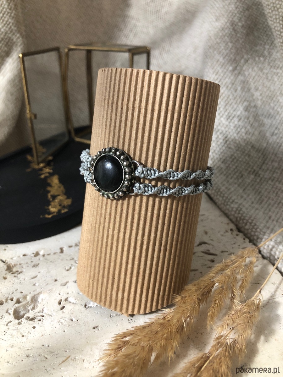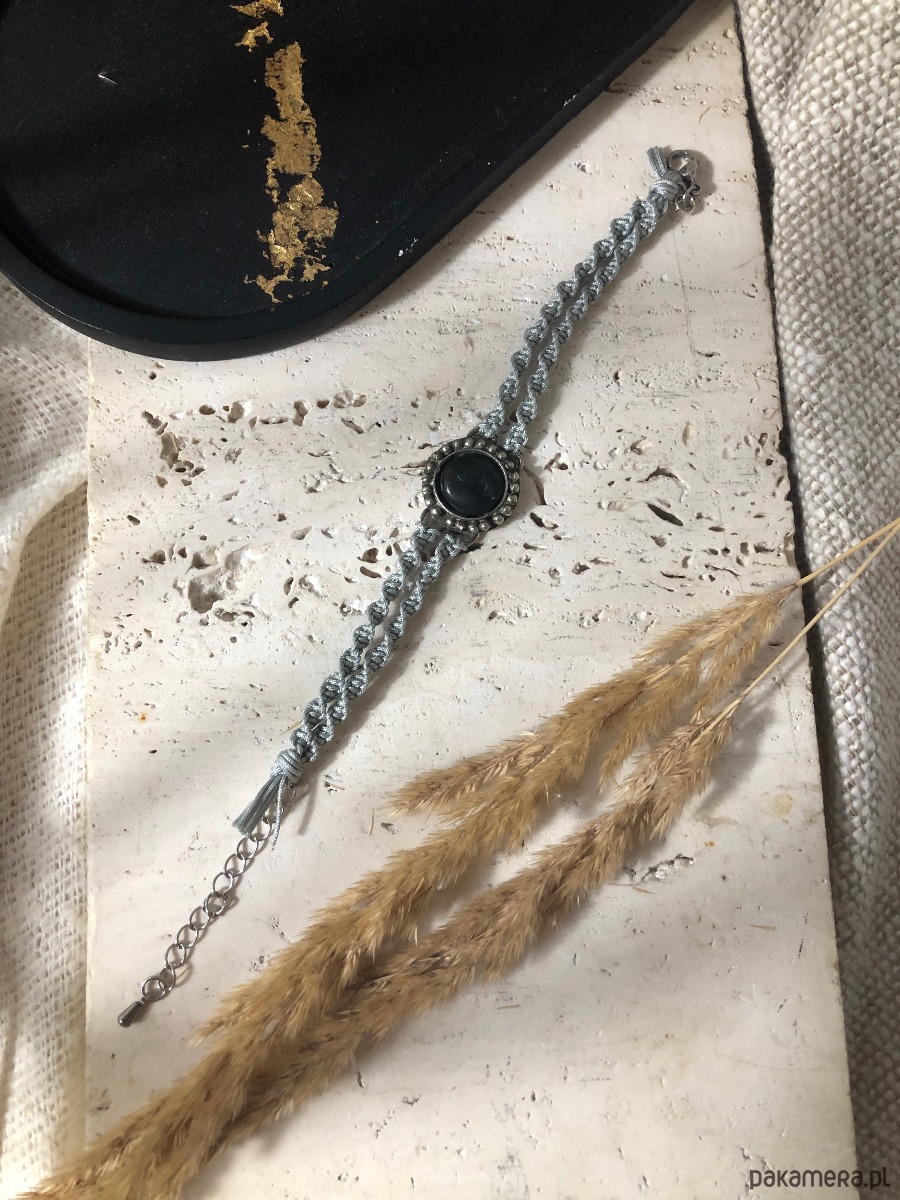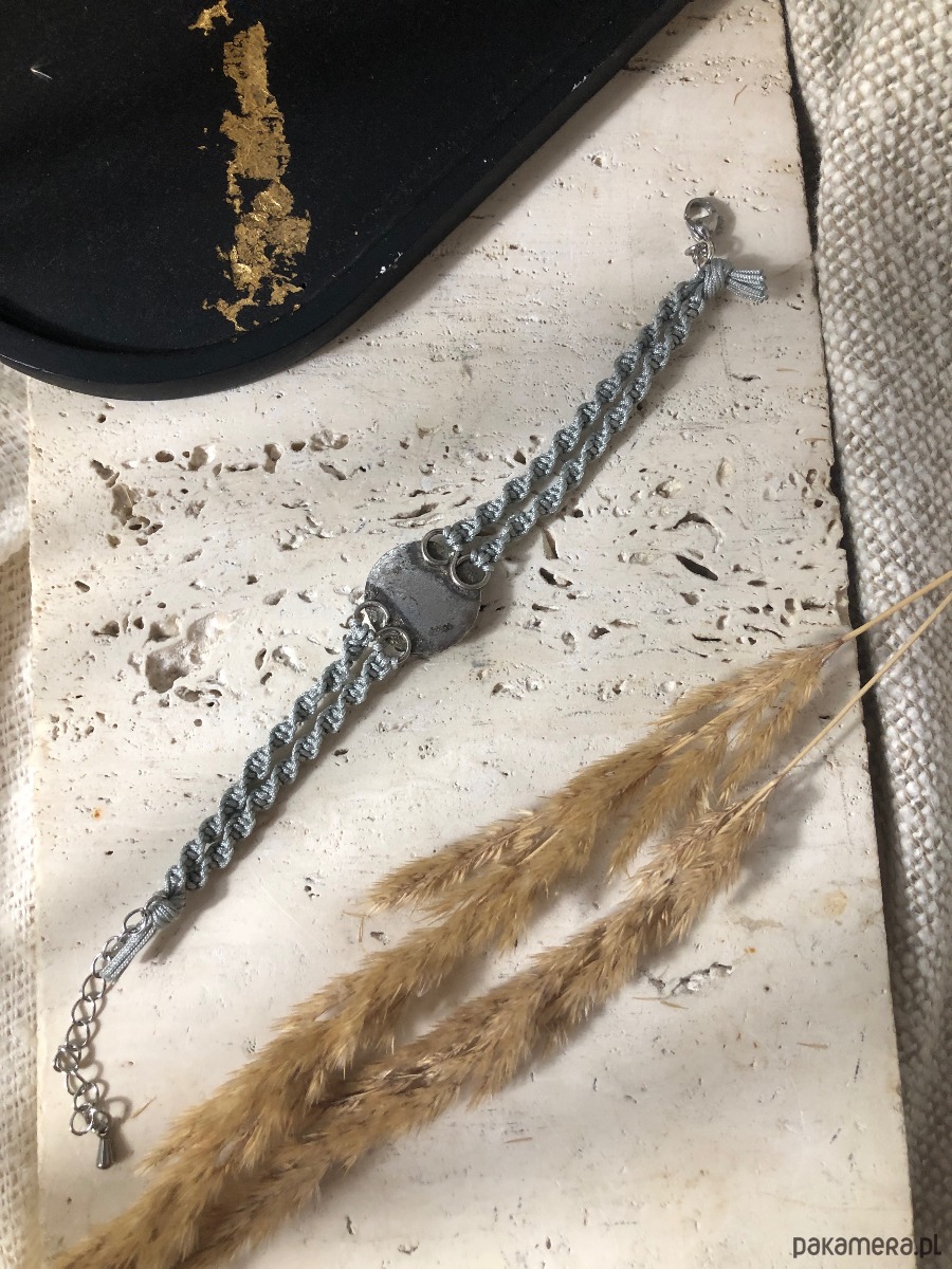 Bransoletka wypleciona ze sznurka techniką makramy z oprawionym hematytem. Metalowy element z kamieniem pochodzi z odzysku ze starej bransolety. Został oczyszczony i ponownie wykorzystany. Bransoletka ma zapięcie typu karabińczyk z przedłużką ze stali chirurgicznej.