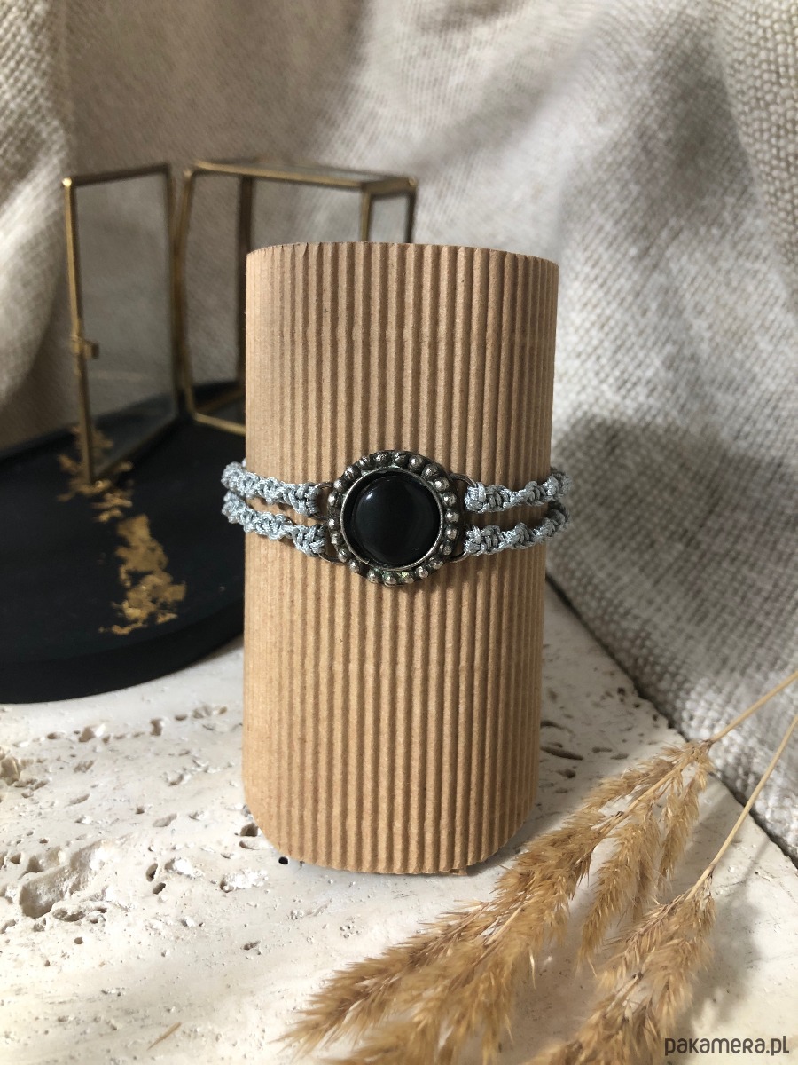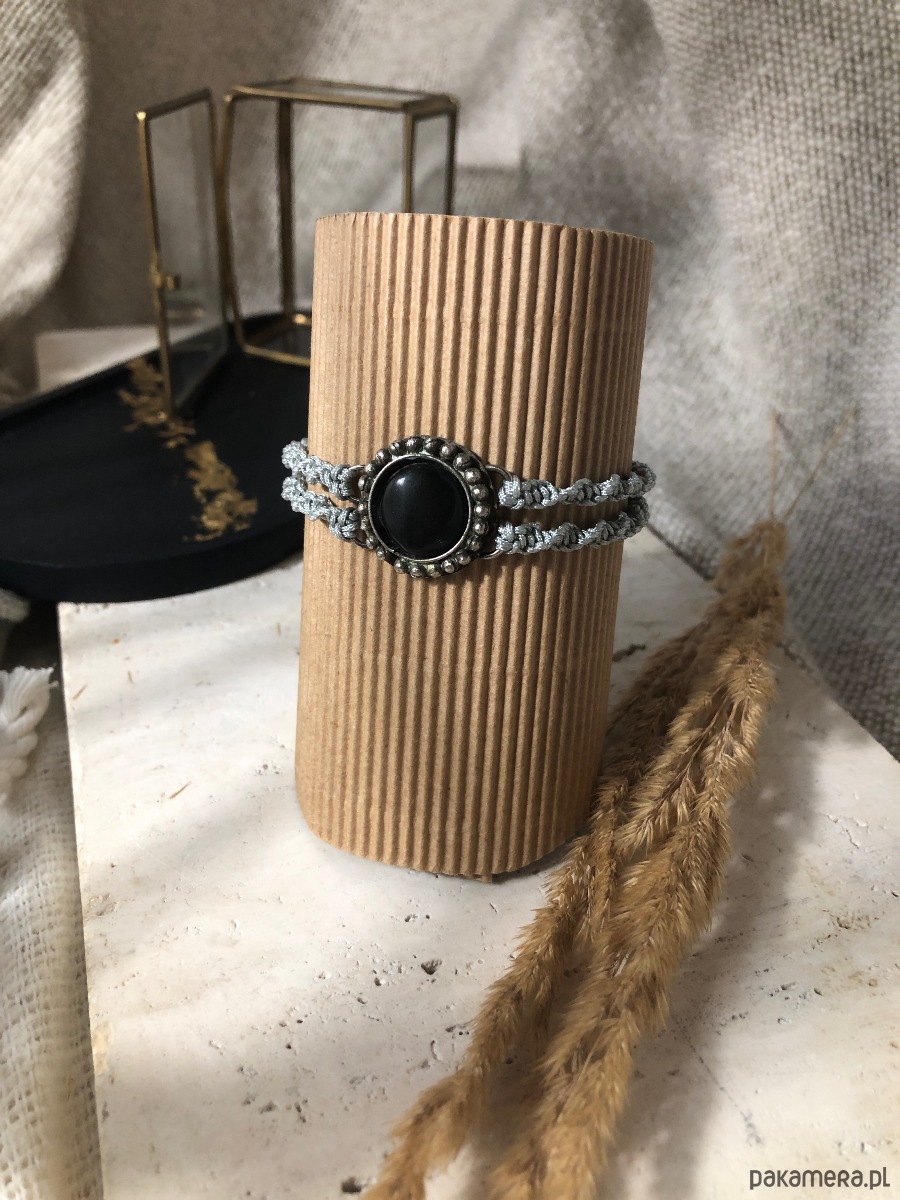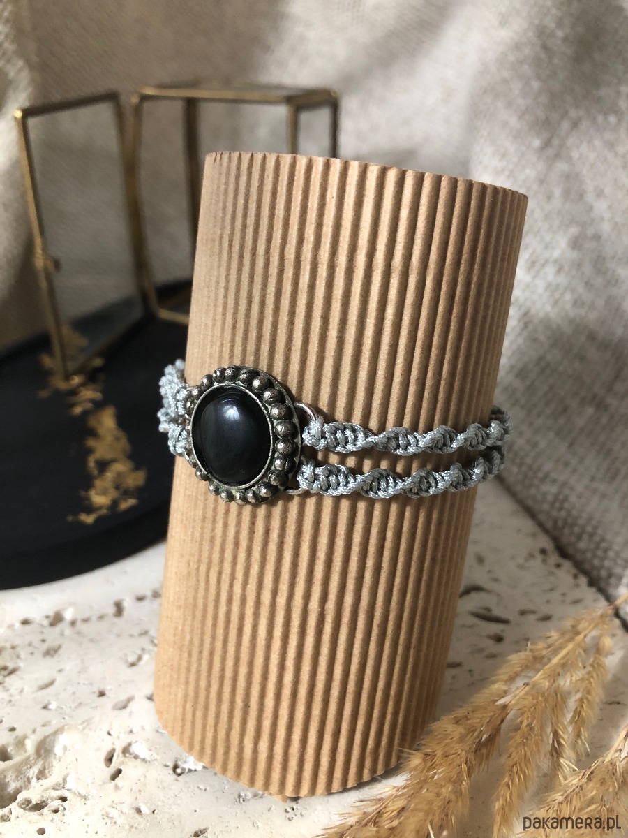 Bransoletka wypleciona ze sznurka techniką makramy z oprawionym hematytem. Metalowy element z kamieniem pochodzi z odzysku ze starej bransolety. Został oczyszczony i ponownie wykorzystany. Bransoletka ma zapięcie typu karabińczyk z przedłużką ze stali chirurgicznej.
