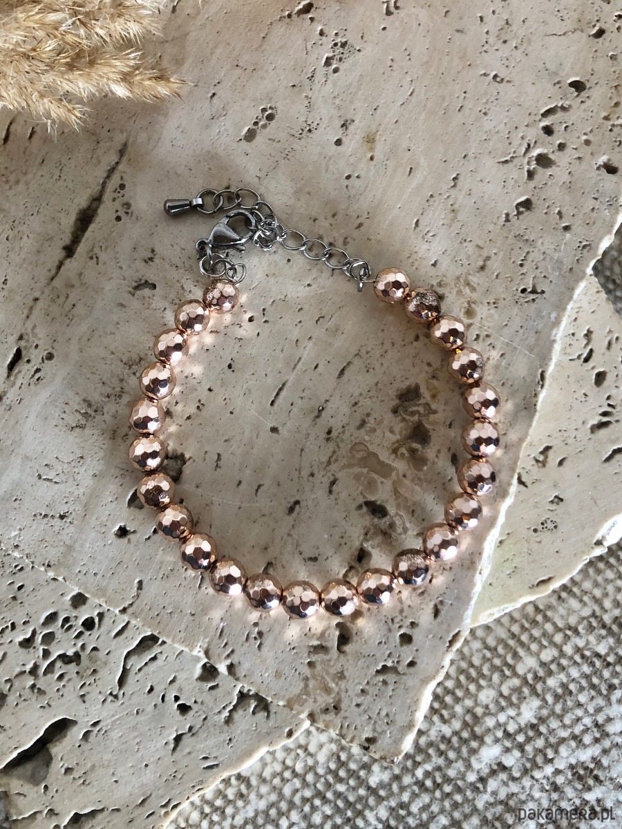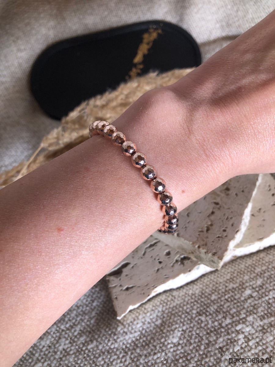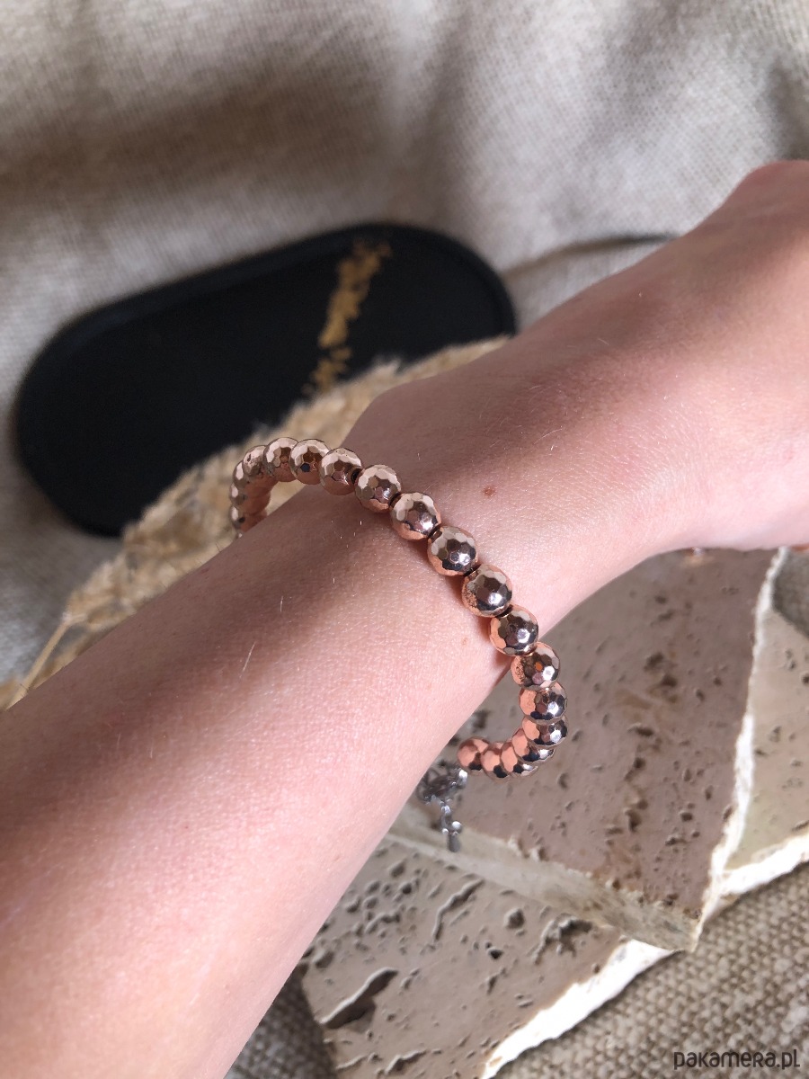 Bransoletka wykonana z kamieni naturalnych. Na drut jubilerski nawleczono hematyt o średnicy 6 mm. Obwód bransoletki można regulować za pomocą karabińczyka z przedłużką ze stali chirurgicznej.