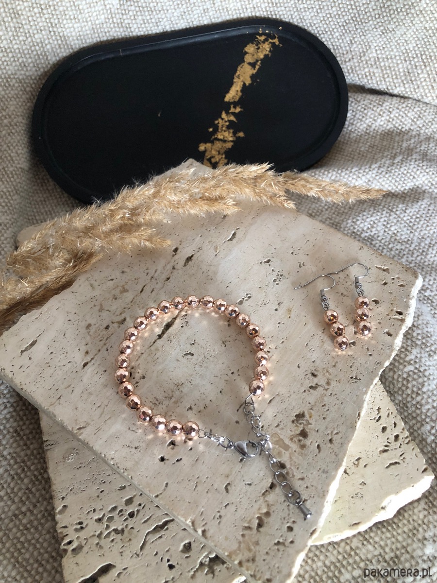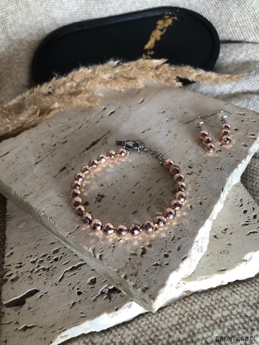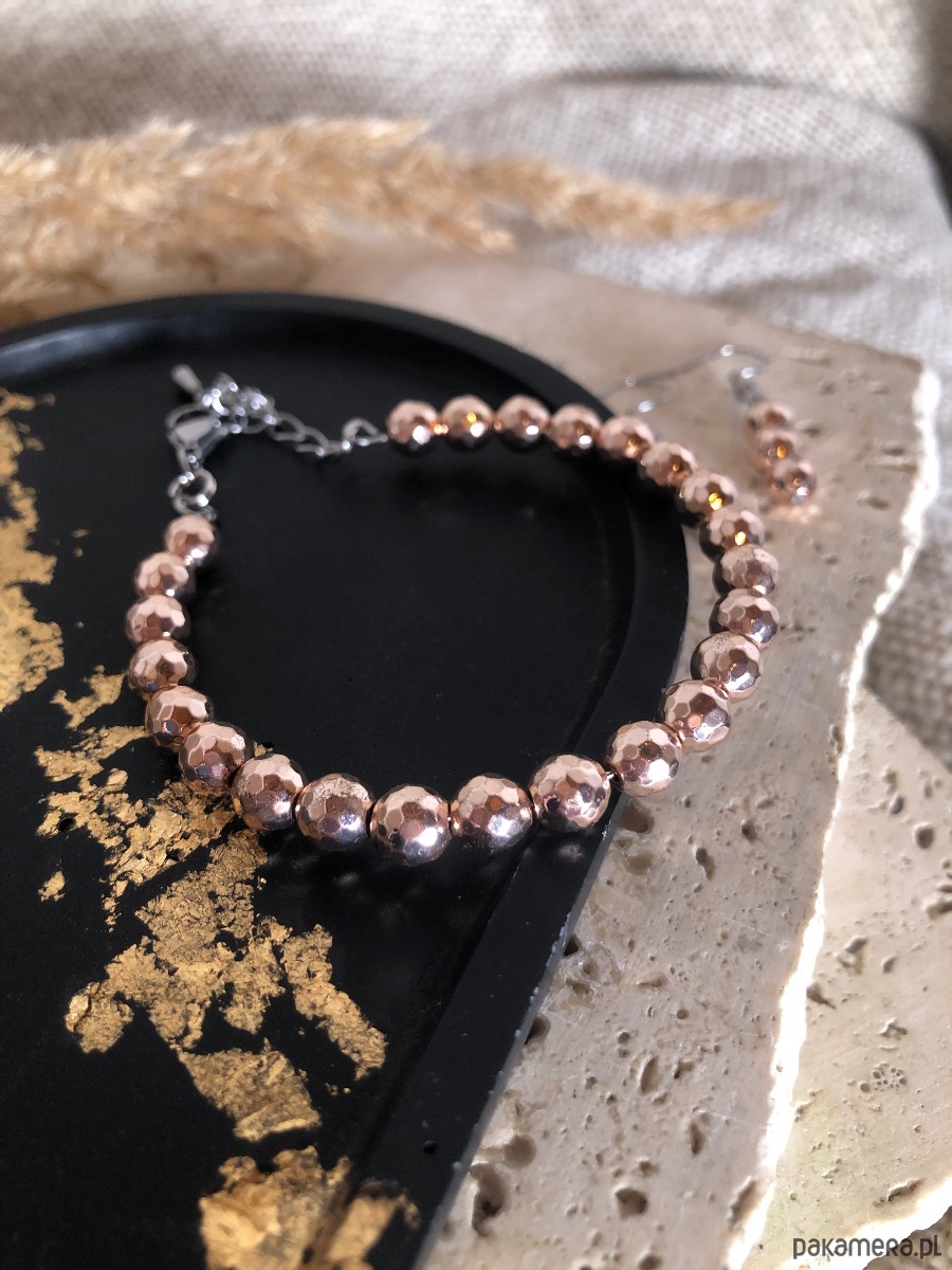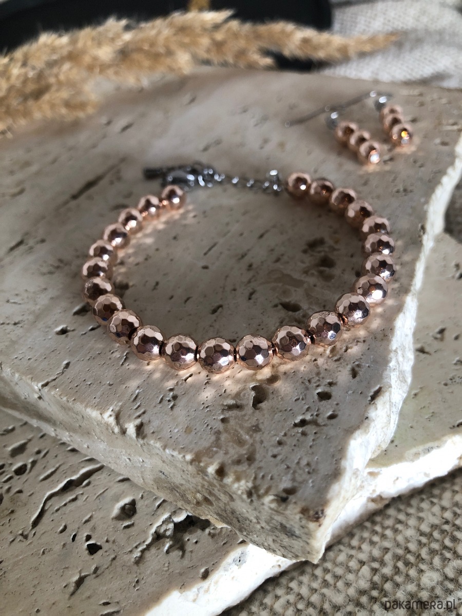 Bransoletka wykonana z kamieni naturalnych. Na drut jubilerski nawleczono hematyt o średnicy 6 mm. Obwód bransoletki można regulować za pomocą karabińczyka z przedłużką ze stali chirurgicznej.