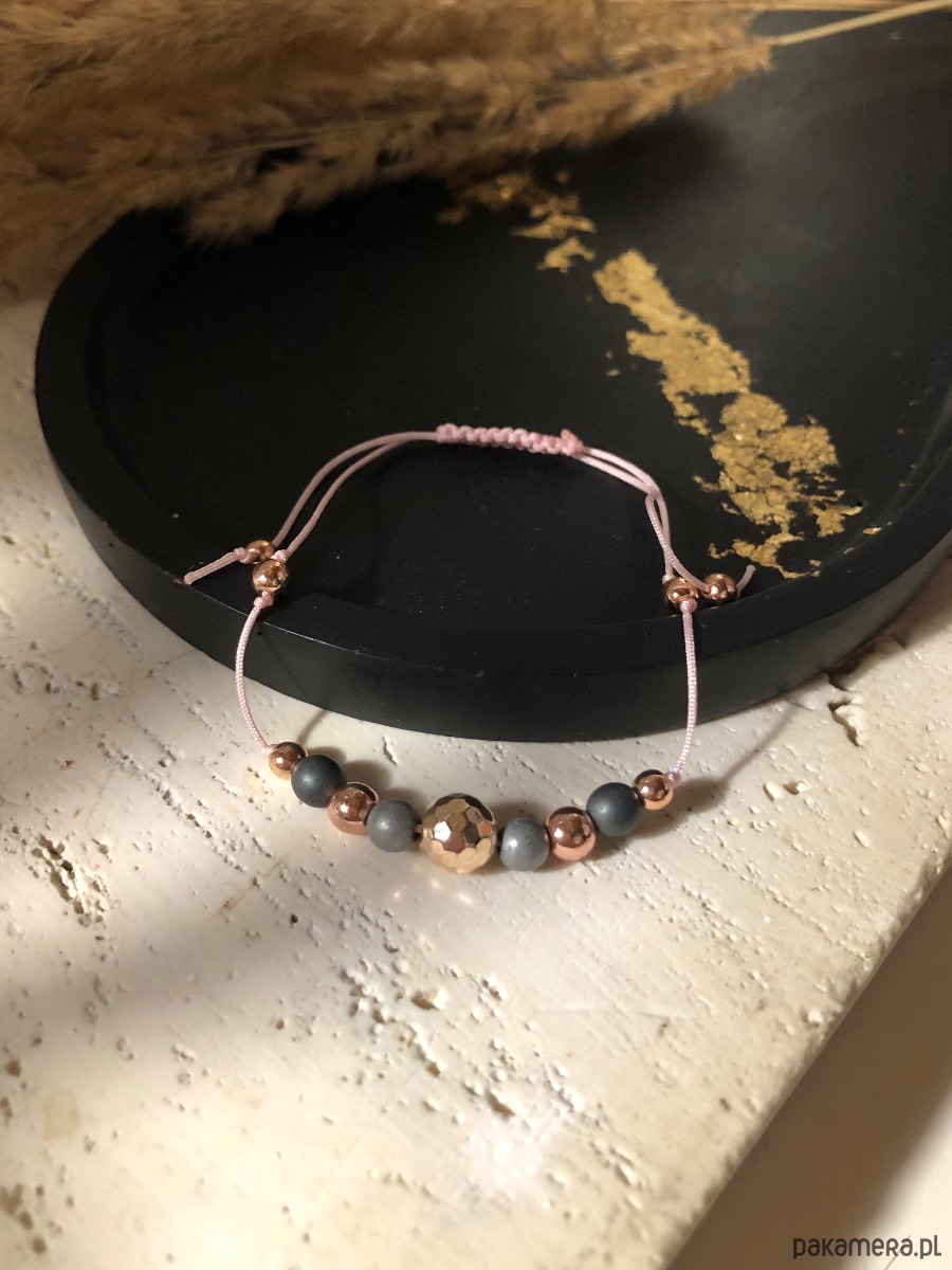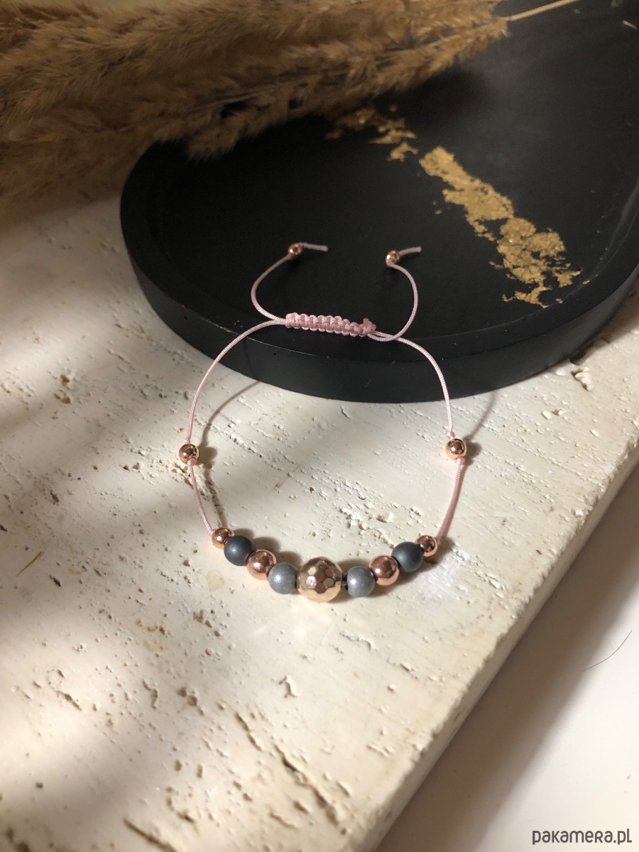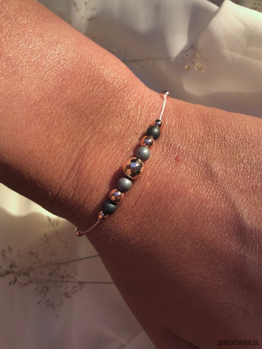 Bransoletka wykonana z naturalnych kamieni. Rozmiar bransoletki można regulować za pomocą plecionego stopera. Na sznurek nawleczono kamienie hematytu platerowanego o średnicy 4 - 6 mm.