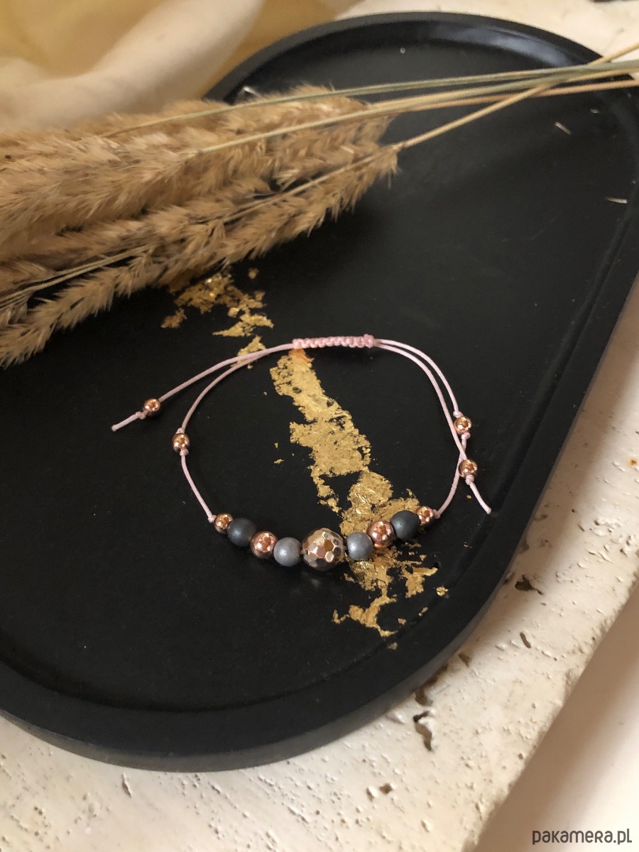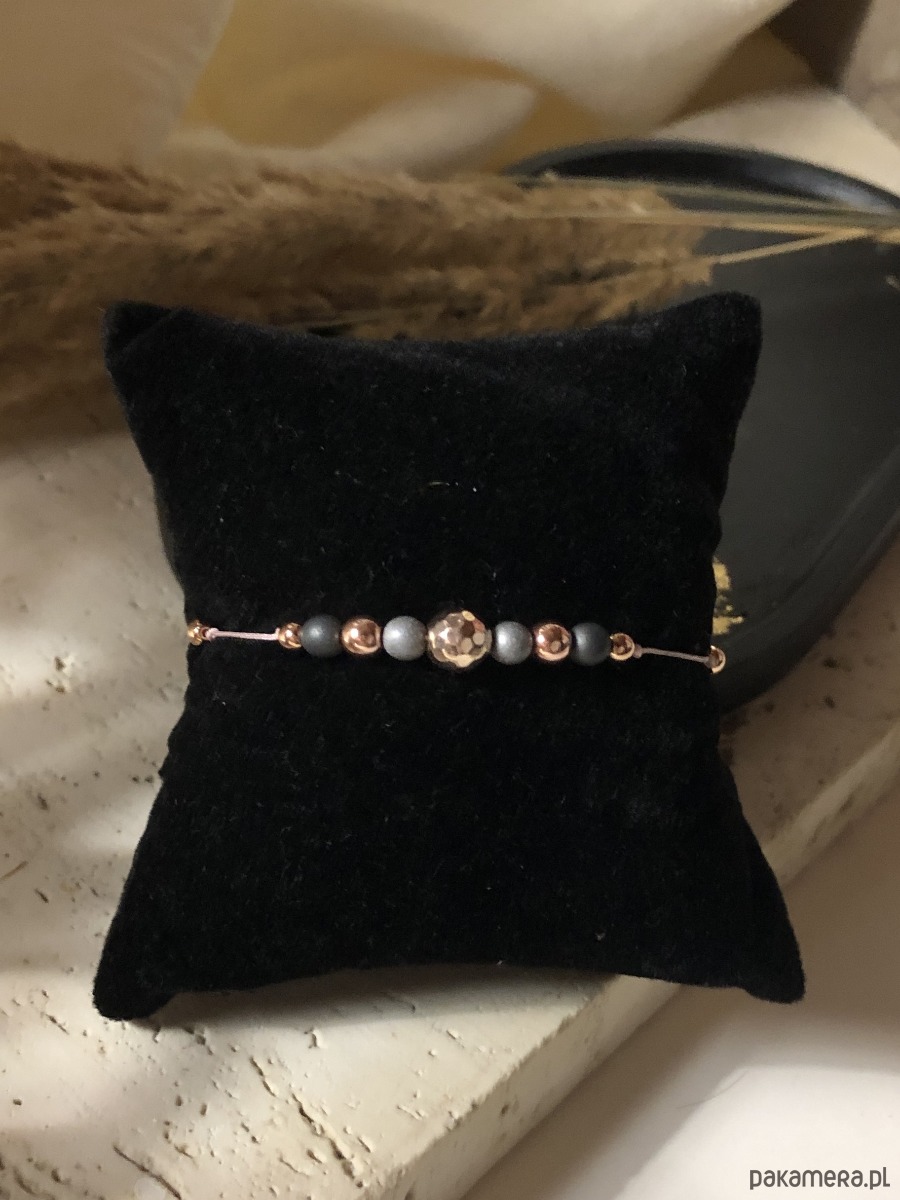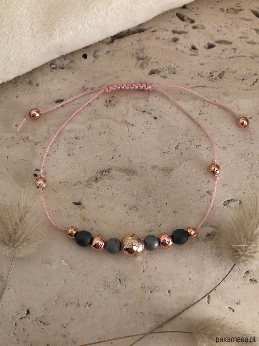 Bransoletka wykonana z naturalnych kamieni. Rozmiar bransoletki można regulować za pomocą plecionego stopera. Na sznurek nawleczono kamienie hematytu platerowanego o średnicy 4 - 6 mm.