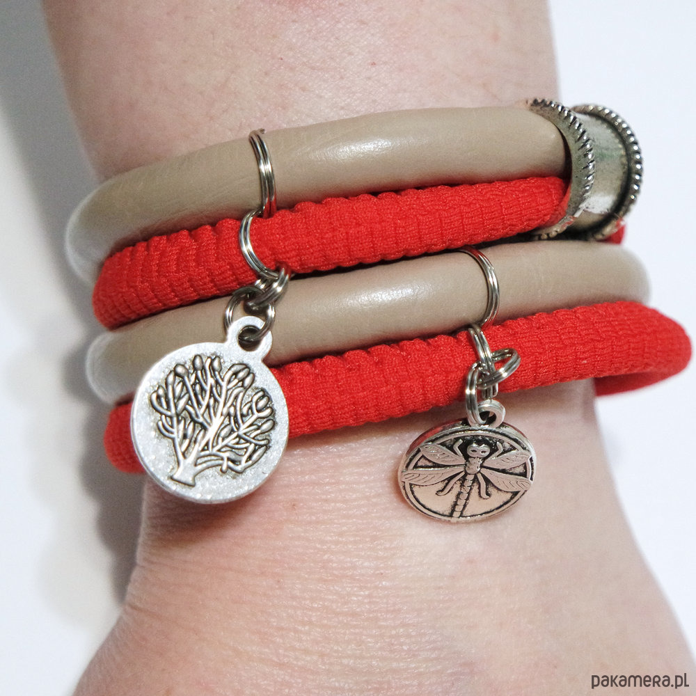 Bransoletka wykonana jest z rzemieni z eko-skóry oraz materiału.