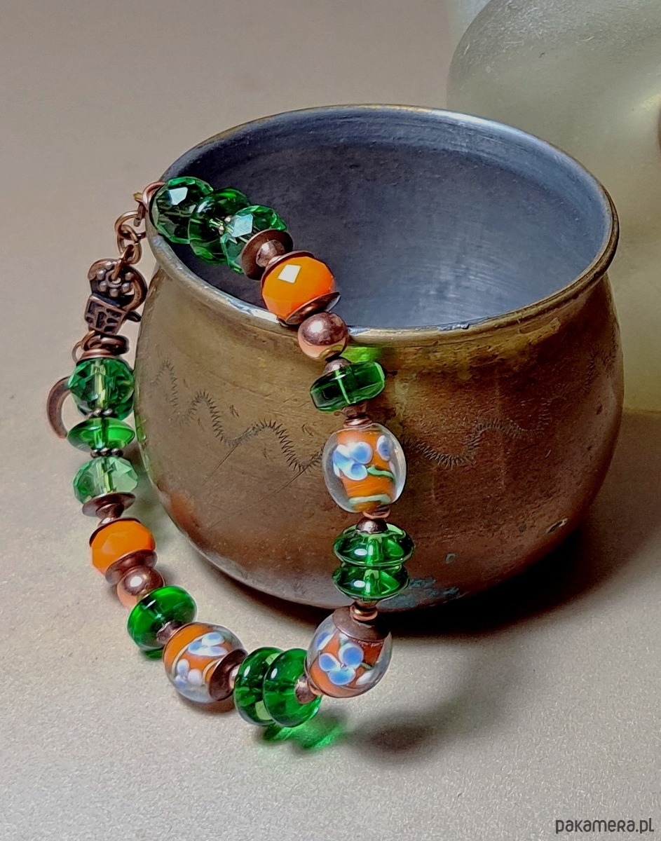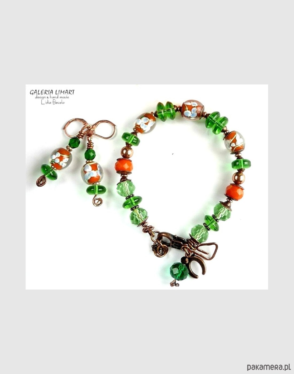 Uwielbiam tworzyć piękne komplety z mixu przeróżnych, ale bardzo starannie dobranych kolorystycznie i wielkościowo elementów ozdobnych w tym przypadku takich jak w kolczykach: piękne szkło weneckie i czysta miedź, a w bransoletce:. takie samo jak w kolczykach piękne szkło weneckie i kryształy w idealnie skomponowanej modnej pomarańczowo-zielonej tonacji ozdoby i zapięcie z miedzi. Bransoletka jest w sam raz na obwód nadgarstka 15-17 cm.